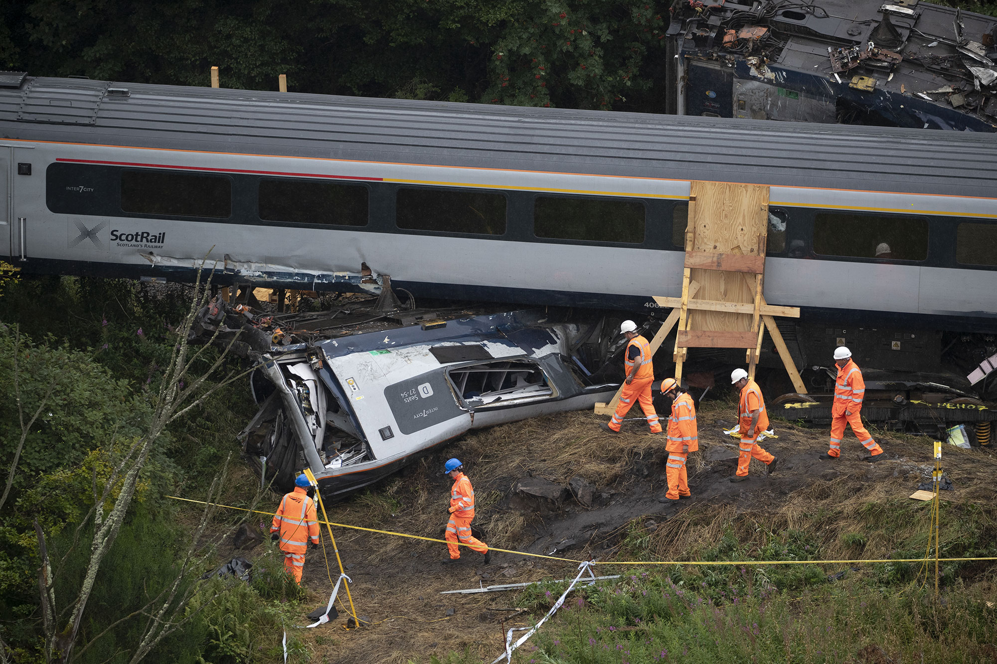 调查人员在苏格兰斯通黑文发生的一起苏格兰铁路列车出轨事故现场工作,该事故发生在2020年。