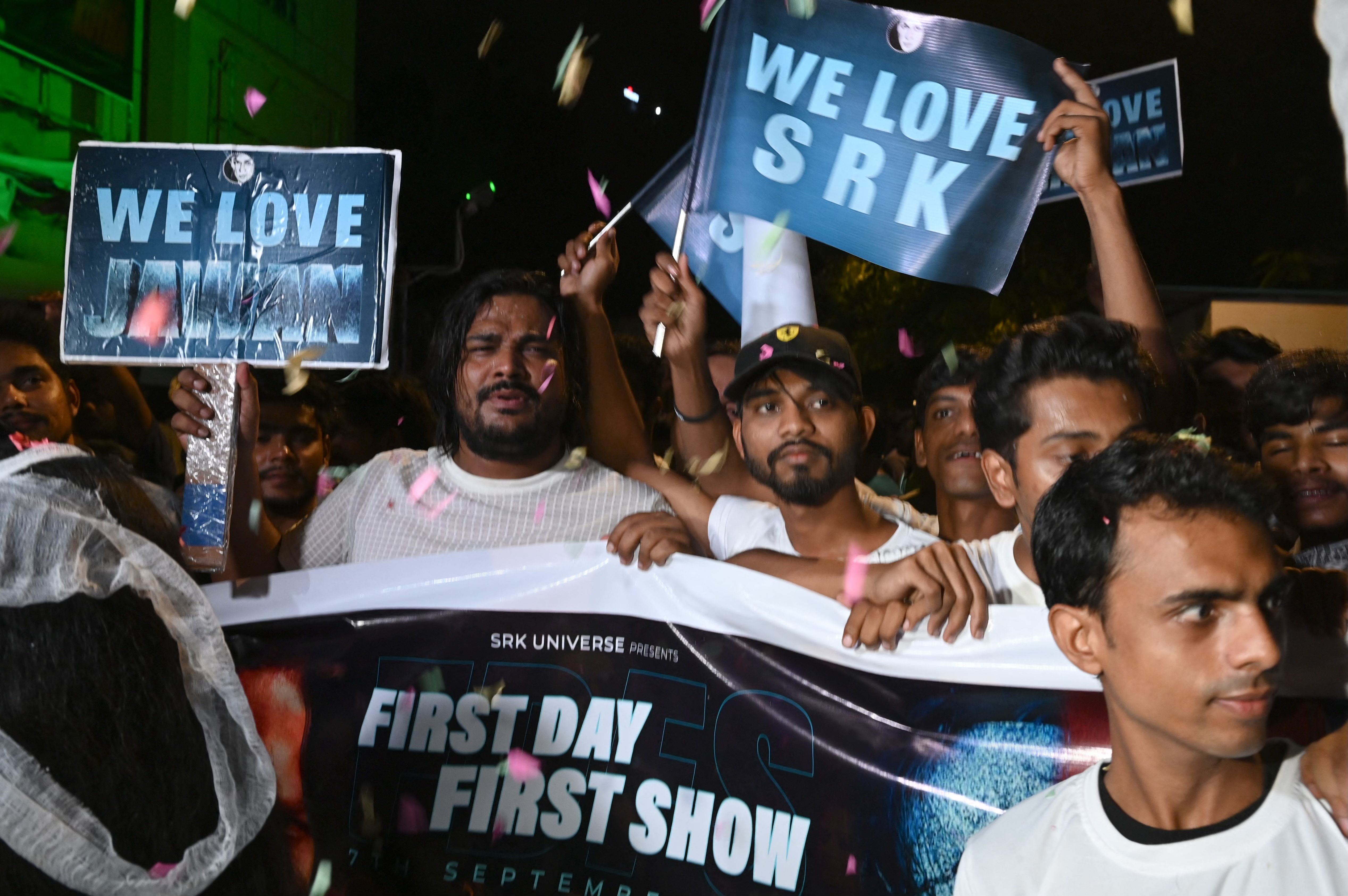 沙鲁克·汗的粉丝在孟买观看《士兵》的放映会外,2023年9月7日。
