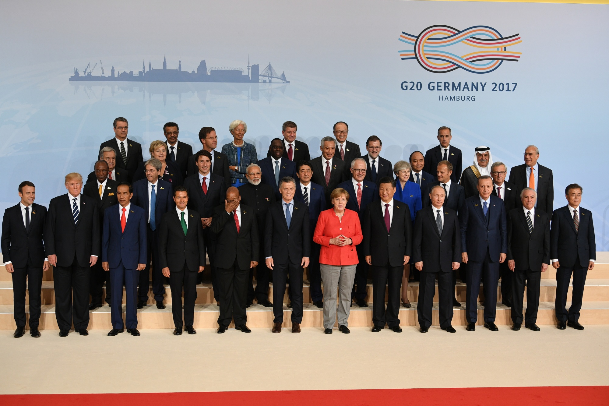 领导人在2017年德国汉堡举行的G-20峰会期间合影。摄影师:Stefan Rousseau/WPA Pool/Getty Images2017年德国主办的G-20峰会以一幕让其他领导人自发站起鼓掌向安格拉·默克尔致敬的时刻以及震撼主办城市汉堡的反资本主义暴动而引人注目,这场暴动几乎让市长——奥拉夫·肖尔茨——失去了工作。当然,肖尔茨后来成功继任默克尔成为德国总理。