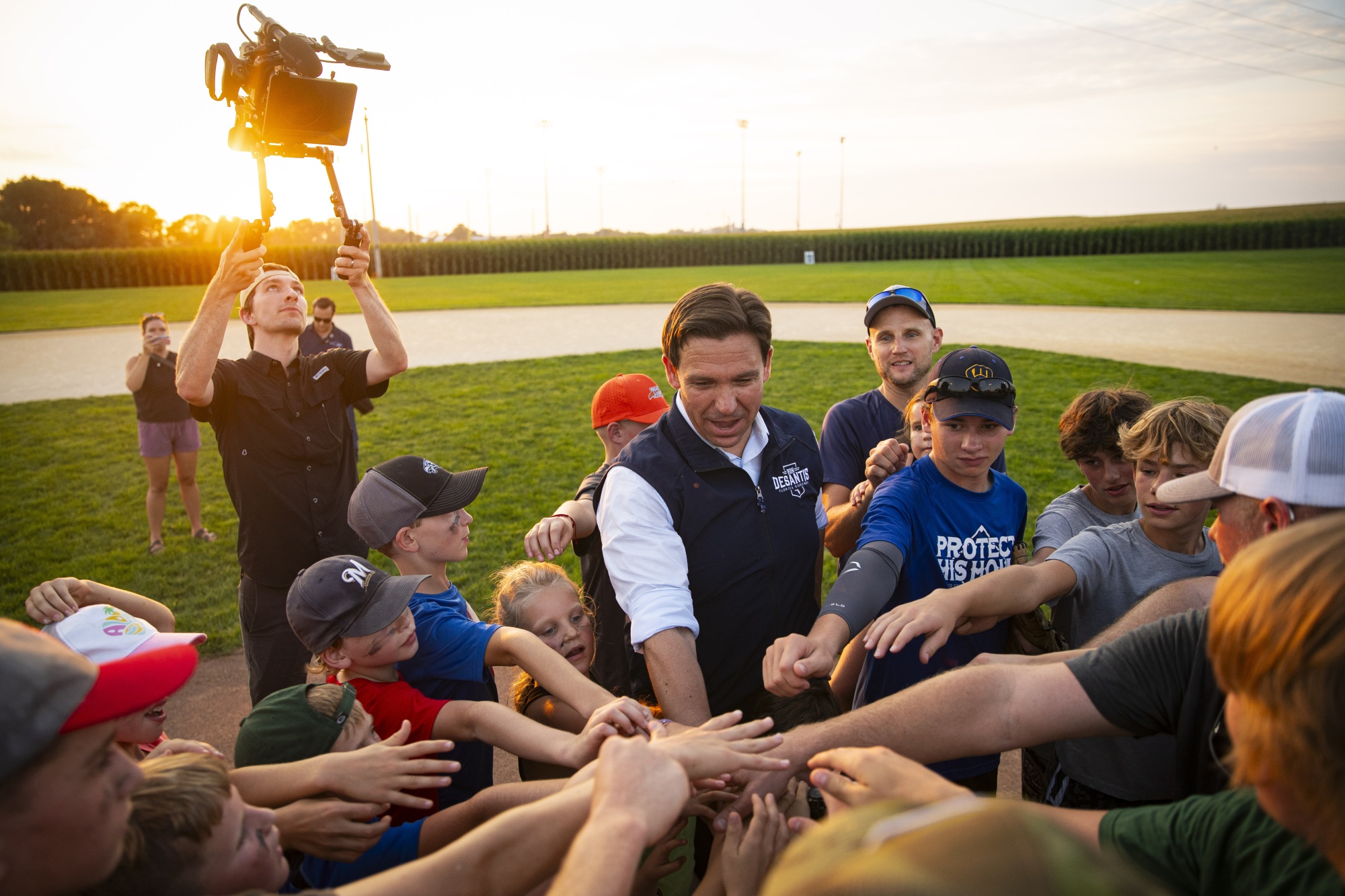 罗恩·德桑蒂斯在八月份的爱荷华竞选活动中与当地棒球运动员聚在一起。摄影师:阿尔·德拉戈/彭博社德桑蒂斯竞选团队发言人指出最近一份民意调查显示,德桑蒂斯和特朗普在爱荷华共和党预选选民中获得了相同的支持率。德桑蒂斯的官员们正在将策略集中在明年一月的这次预选中,这是共和党的第一场提名竞赛。