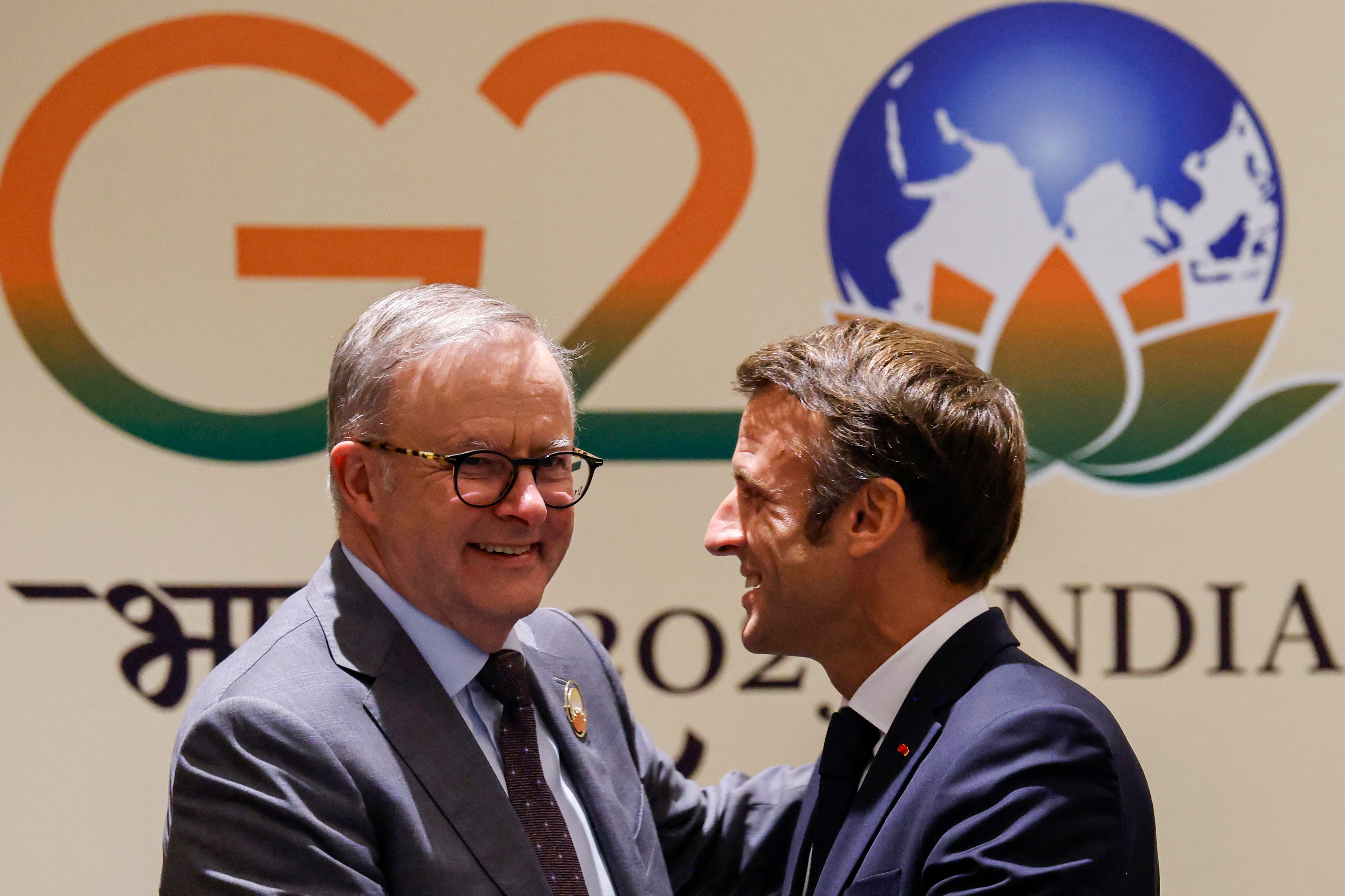 安东尼·阿尔巴尼斯与埃马纽埃尔·马克龙在9月9日新德里举行的G20领导人峰会期间合影。摄影师:LUDOVIC MARIN/Getty Images*早上好,我是马修。以下是您开始一天所需了解的内容。*今日必读:• G20自由贸易谈判• 澳元可能会上涨• 全黑选举范式