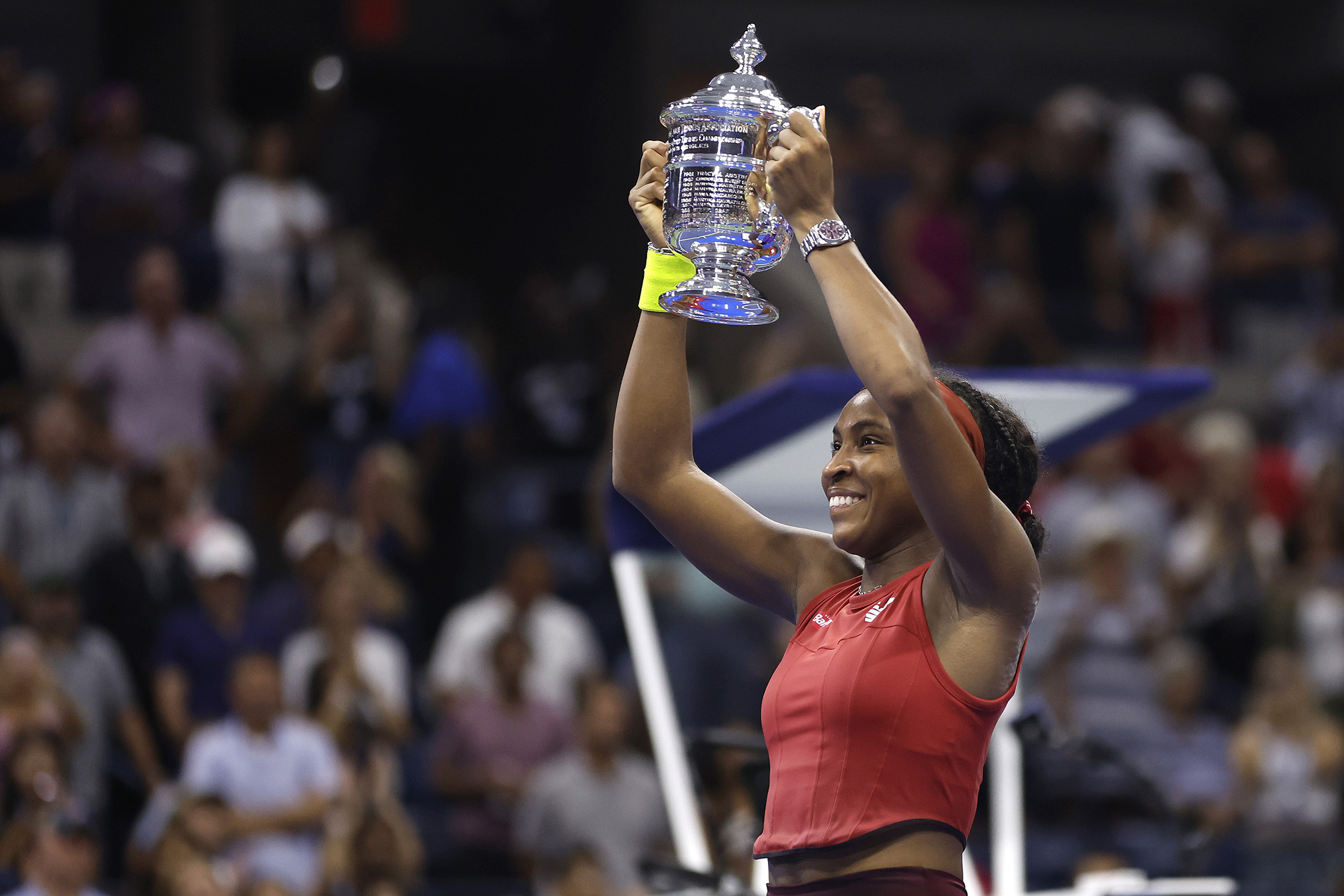 Coco Gauff赢得2023年美国公开赛后举起奖杯。摄影师:Sarah Stier/Getty Images North America最后, 在Coco Gauff逆转击败Aryna Sabalenka后,她成为自2001年Serena Williams以来第一个赢得美国公开赛的美国少年选手,Novak Djokovic将在今天的男子决赛中追求他的第24个大满贯单打冠军。
