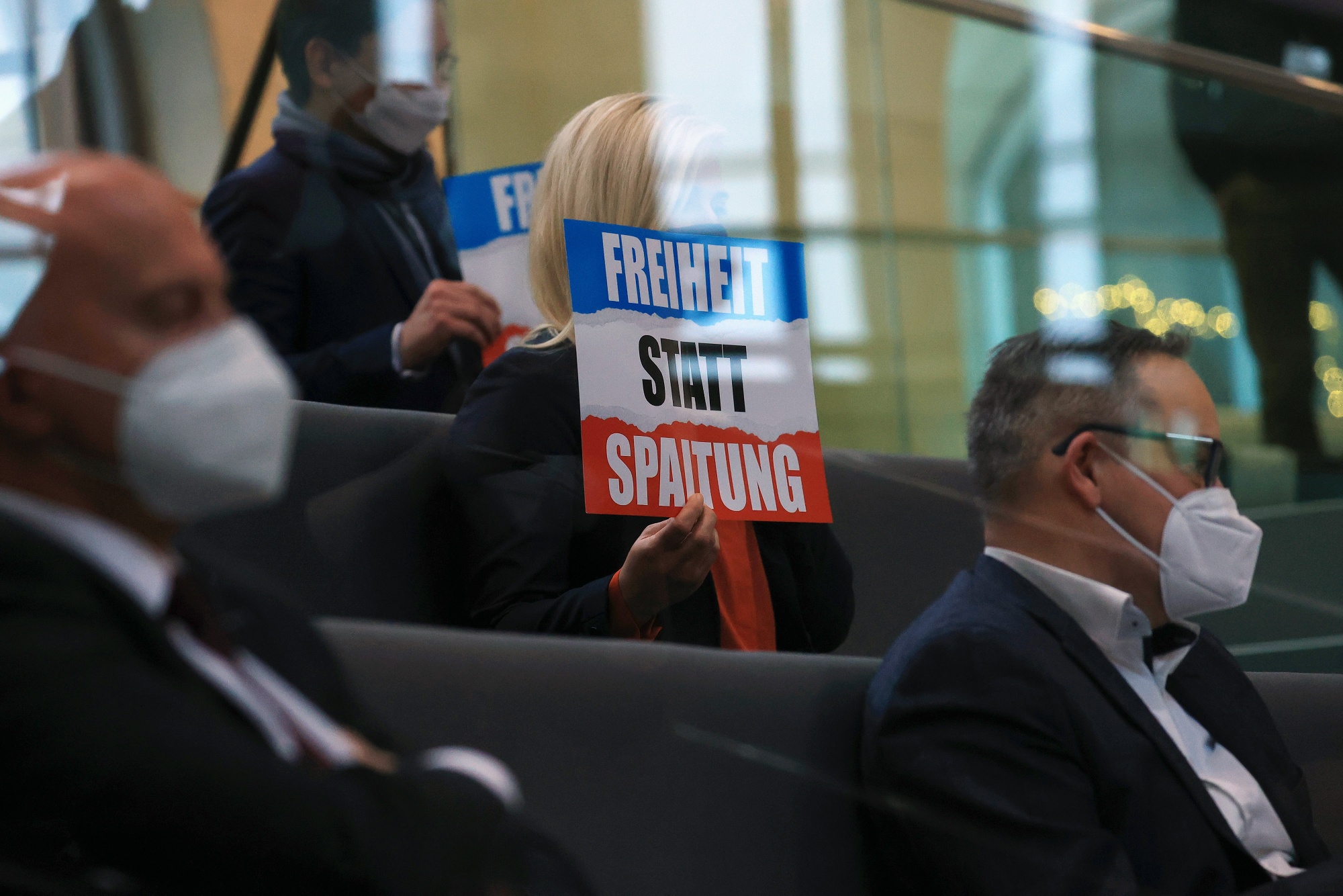 在2022年1月,AFD的成员在柏林的联邦议院展示标语,上面写着“自由而非分裂”。该党在新冠疫情封锁期间的支持率上升。摄影师:Krisztian Bocsi/Bloomberg尽管极右翼的威胁被夸大了,但即使它正处于高峰期,他说。“极右翼政党的强势表现将加强上升潮的叙事,但政治中心很可能仍将是主导力量。”