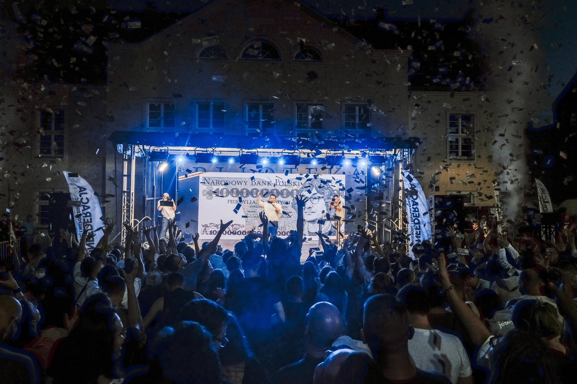 假钞纷纷从天空中落下,上面印有当前波兰总理莫拉维茨基的图片,在奥尔什丁的集会上。摄影师:达米安·莱曼斯基/彭博社回到波兰城市奥尔什丁,简单的信息传递 resonated 了人群。“我们是好人,他们是坏人,”联盟共同领袖门岑对支持者说。