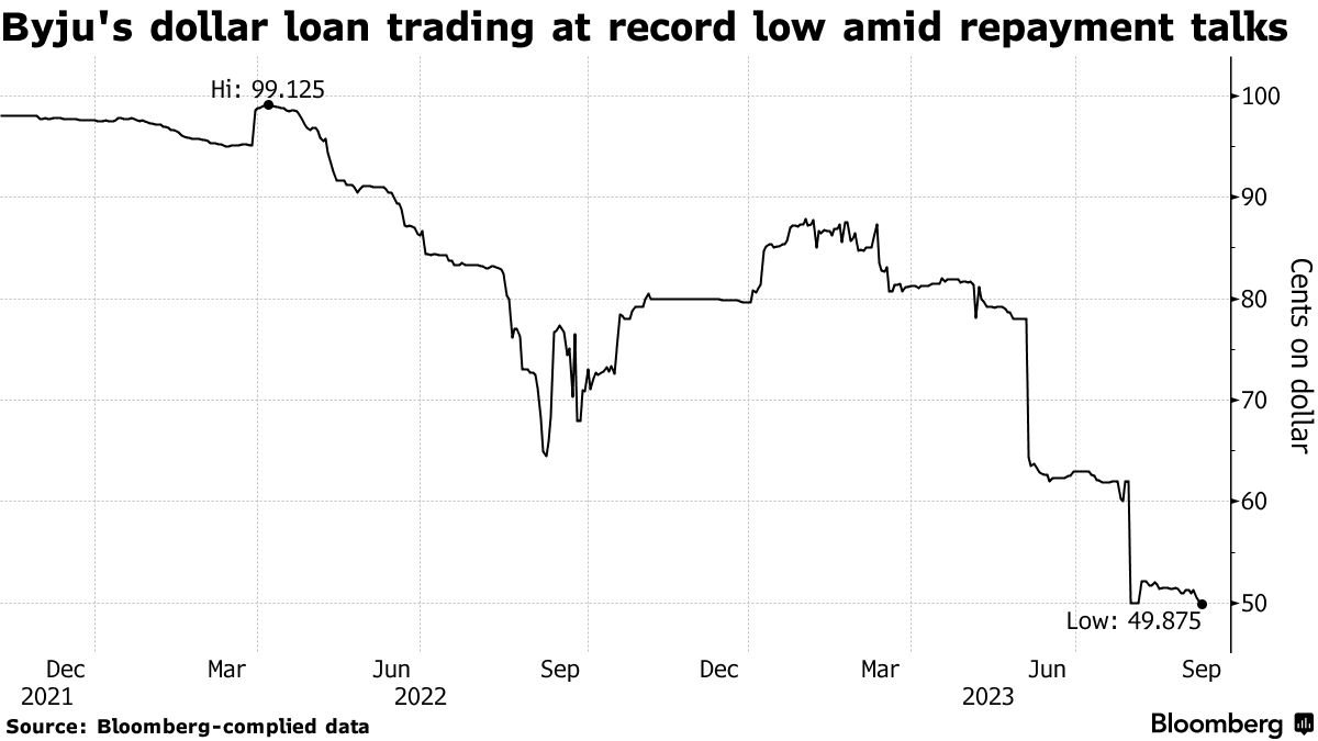 这家公司的母公司正式名称为Think & Learn Pvt,于2021年通过五年贷款来增强其在印度以外的增长。彭博编制的数据显示,该贷款的报价为每美元49.8美分。一般认为低于70的水平属于困境。