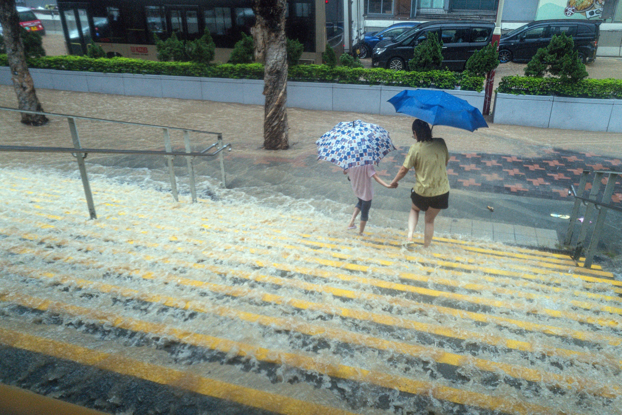 居民在9月8日香港暴雨中涉水前行。