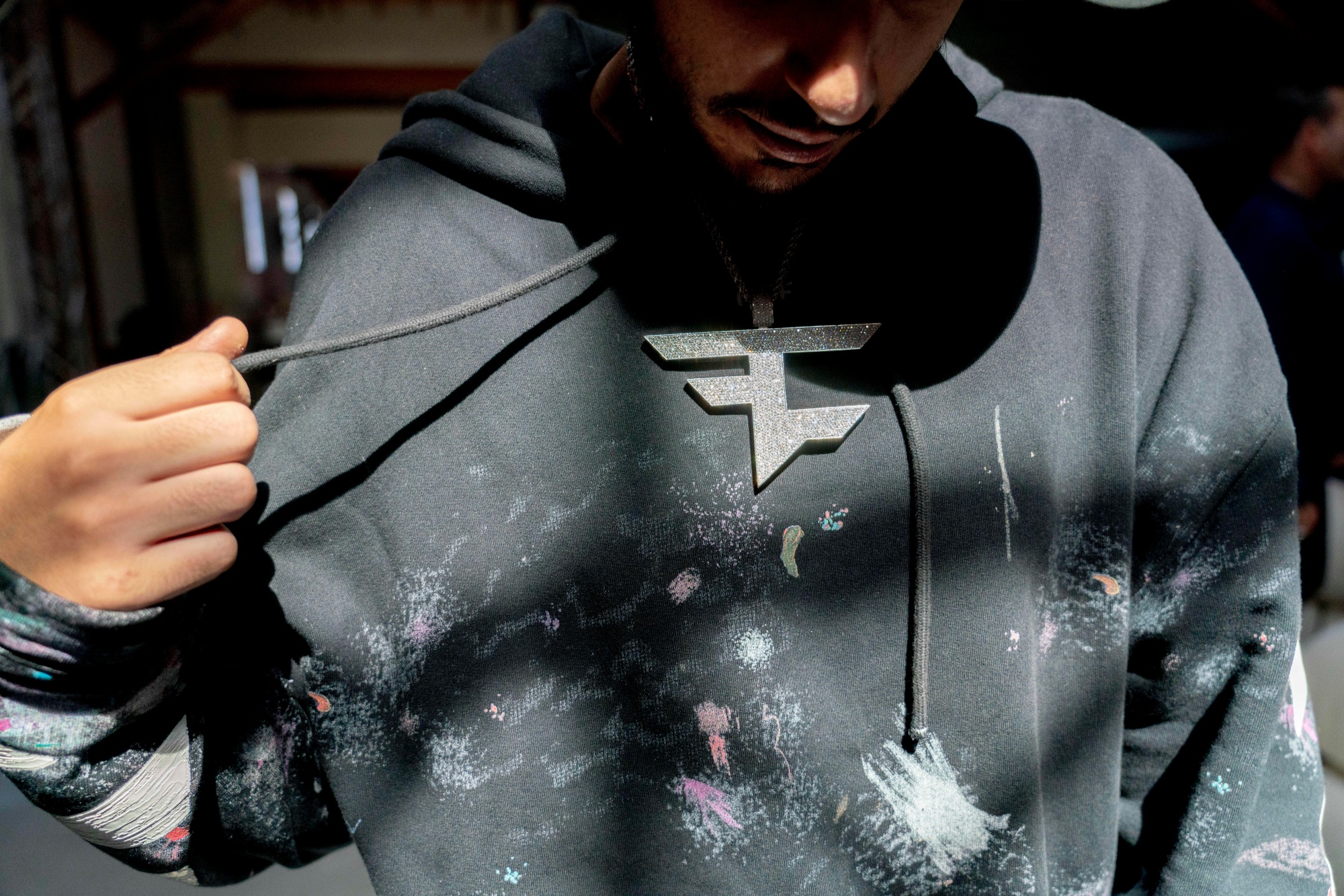 诺丹“FaZe Rain”沙特,一家公司的联合创始人,于2022年7月在洛杉矶的公司总部戴着一条印有FaZe标志的项链。