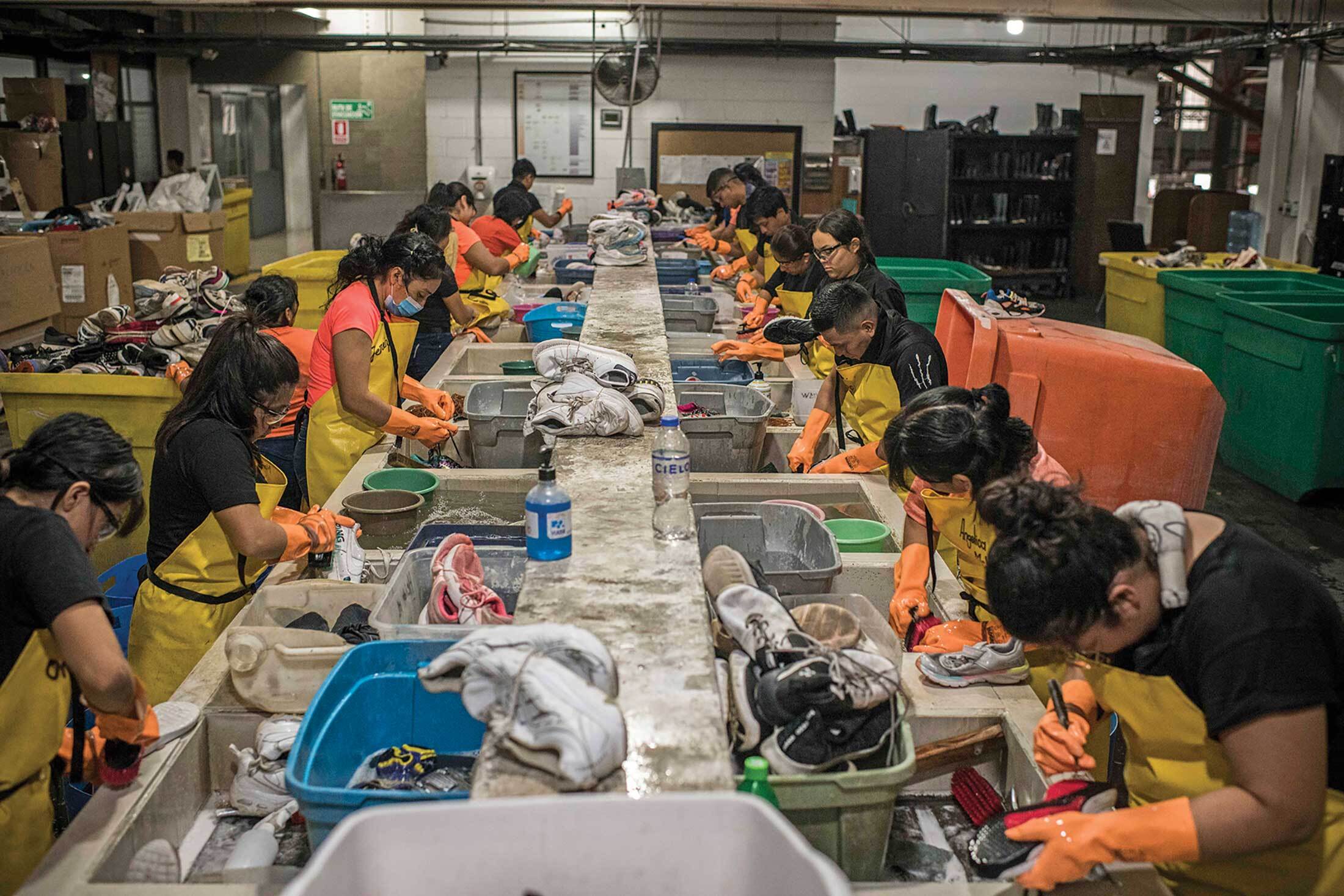 工人在工作。摄影师:Daniele Volpe,彭博商业周刊佩尼带我走上一组金属楼梯,来到一个平台,15名穿着橡胶围裙的员工站在洗涤盆前,刷洗新到货的鞋子上的污垢。一名经验丰富的员工 - 按最低工资(大约每月400美元)加福利(Megapaca表示每月约250美元)支付 - 可以在大约三分钟内将泥泞的运动鞋变成一双收藏级别的鞋子。“清洗可以为鞋子的销售价格增加两到三美元,”佩尼告诉我。这笔钱很快就会累积起来:在我访问期间,Megapaca在危地马拉的库存中包括超过150吨的鞋子。