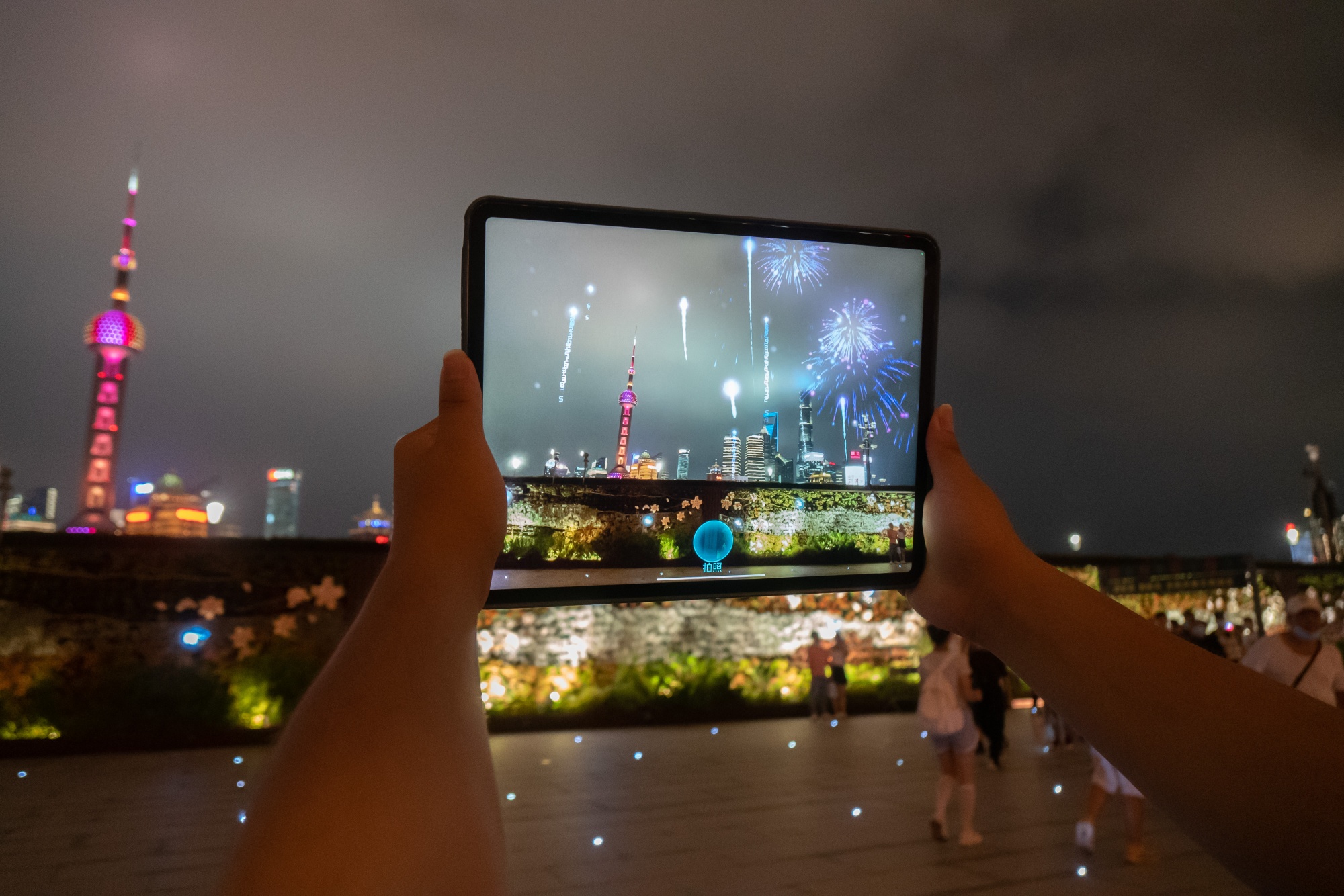 一个“数字孪生”应用程序在2022年第五届世界人工智能大会上创建了一个充满烟花的上海天际线的图像。