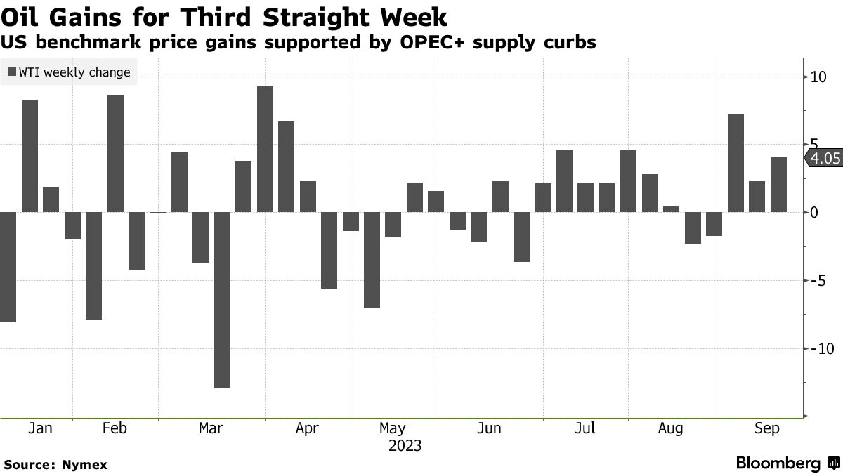 油价连续第三周上涨,过去12周中有10周上涨,因市场继续在沙特阿拉伯和俄罗斯的供应限制下收紧。