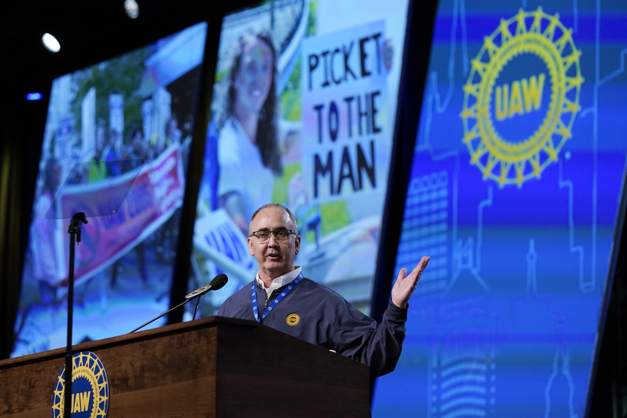 肖恩·费恩在三月份的工会特别谈判大会上发言。摄影师:卡洛斯·奥索里奥/AP照片费恩是第一位由会员直接选举产生的UAW主席,此前他的两位前任及其手下因将工会资金用于高尔夫球杆、豪华住所以及与香槟和雪茄一起享用牛排晚餐而入狱。