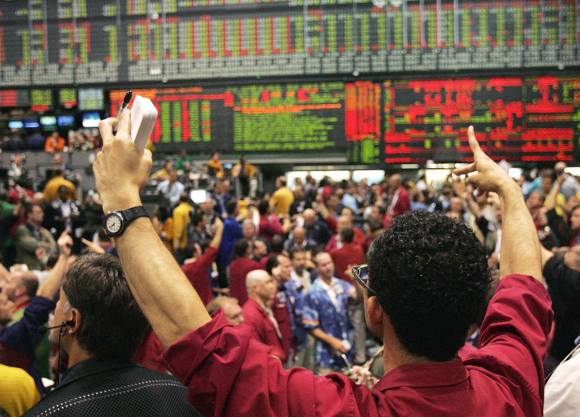 2007年,交易员在芝加哥商品交易所的S&P交易场地上工作。摄影师:Tim Boyle/Bloomberg新闻社。交易已经转移到电子屏幕上。交易匹配的计算机服务器可以很容易地迁移到其他地方,以避开潜在的税收。事实上,芝加哥期权交易所的服务器已经在新泽西。