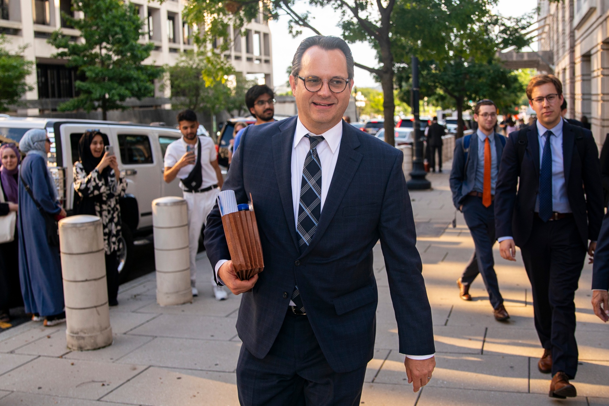 大卫·达尔奎斯特,美国司法部反垄断部门的高级审判律师,在反对谷歌的反垄断审判开始时走出联邦法院摄影师:Al Drago/Bloomberg在周一的庭审中,迪施勒表示他的目标是“寻找创意,以便达到我们的配额。”