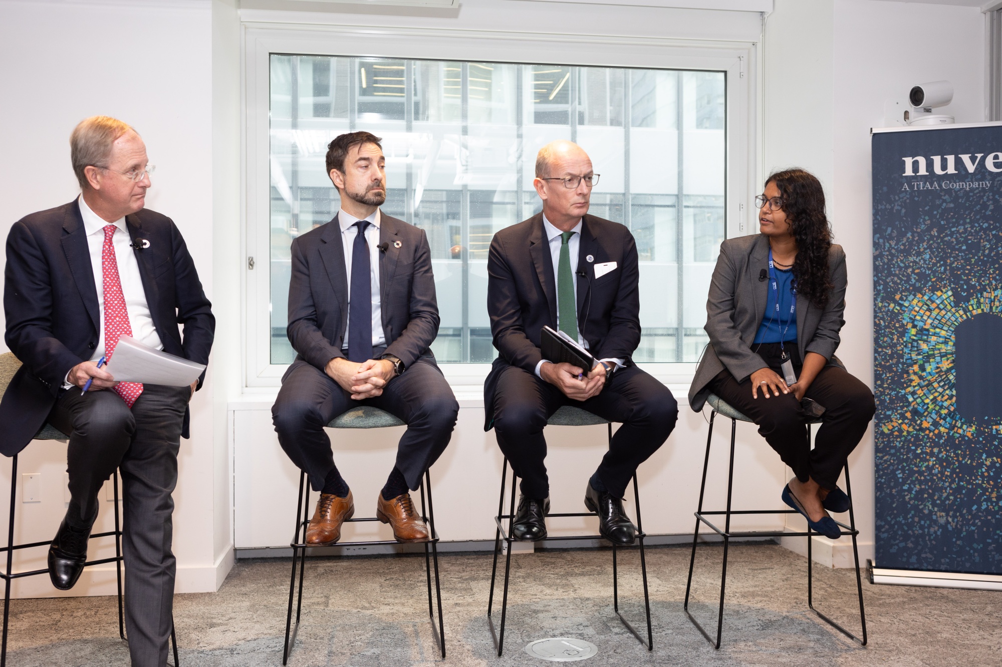 Jules Kortenhorst(左)和Don Dimitrievich(左二)在2023年9月18日在纽约Nuveen办公室举行的有关融资和实施能源转型的专题讨论会上。来源:Nuveen公共固定收益市场的最大优势和能力在于规模化的机会,这是Nuveen负责管理超过180亿美元固定收益ESG和影响投资的Stephen Liberatore表示的。但是,规模化的前提是让投资者对这种结构感到舒适,这可能需要一段时间,他补充道。