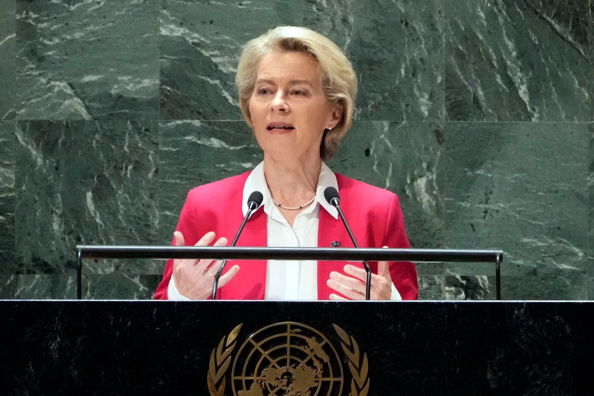欧盟主席乌苏拉·冯·德·莱恩(Ursula von der Leyen)在2023年9月18日星期一出席联合国可持续发展论坛时发表讲话。(美联社照片/理查德·德鲁)