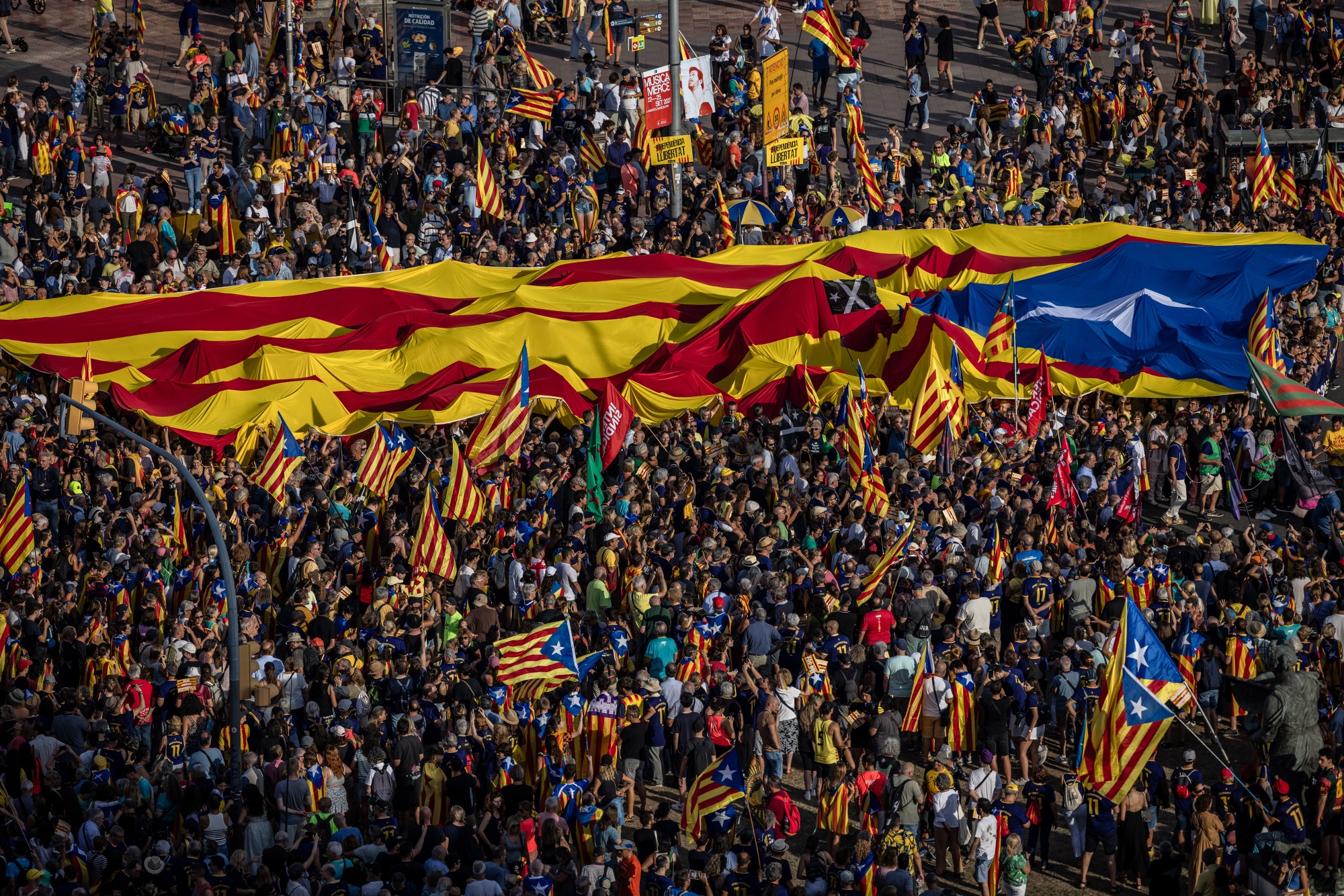 加泰罗尼亚国庆日庆祝活动于9月11日在巴塞罗那举行。摄影师:安赫尔·加西亚/彭博社利比亚东部城镇德尔纳爆发抗议活动居民对官方对一场导致一万多人死亡或失踪的风暴的应对表示愤怒。德尔纳市长的住所被焚烧,示威者要求撤换东部议会,要求对忽视和腐败进行调查。