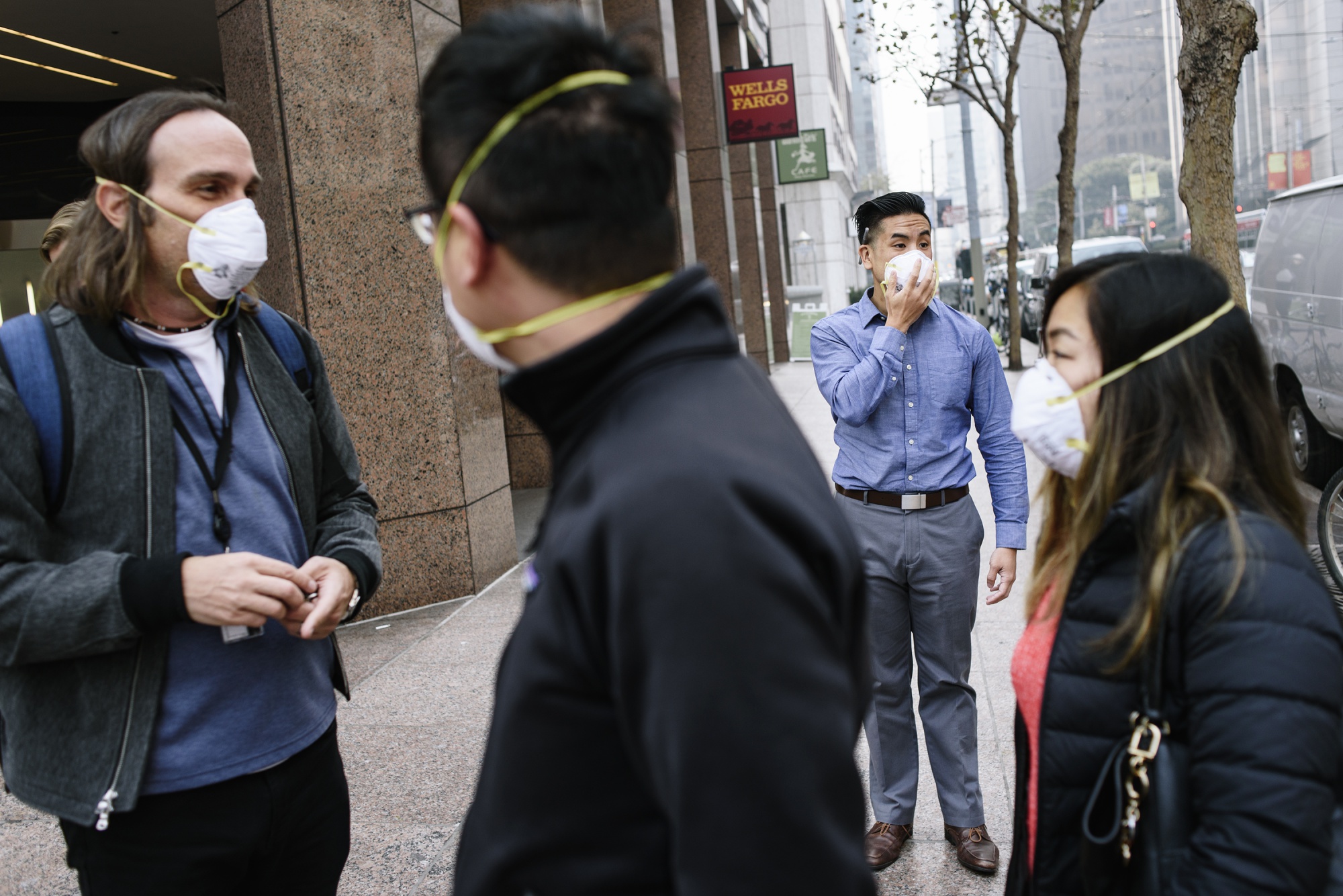 人们在2018年戴口罩以防止旧金山的野火烟雾。