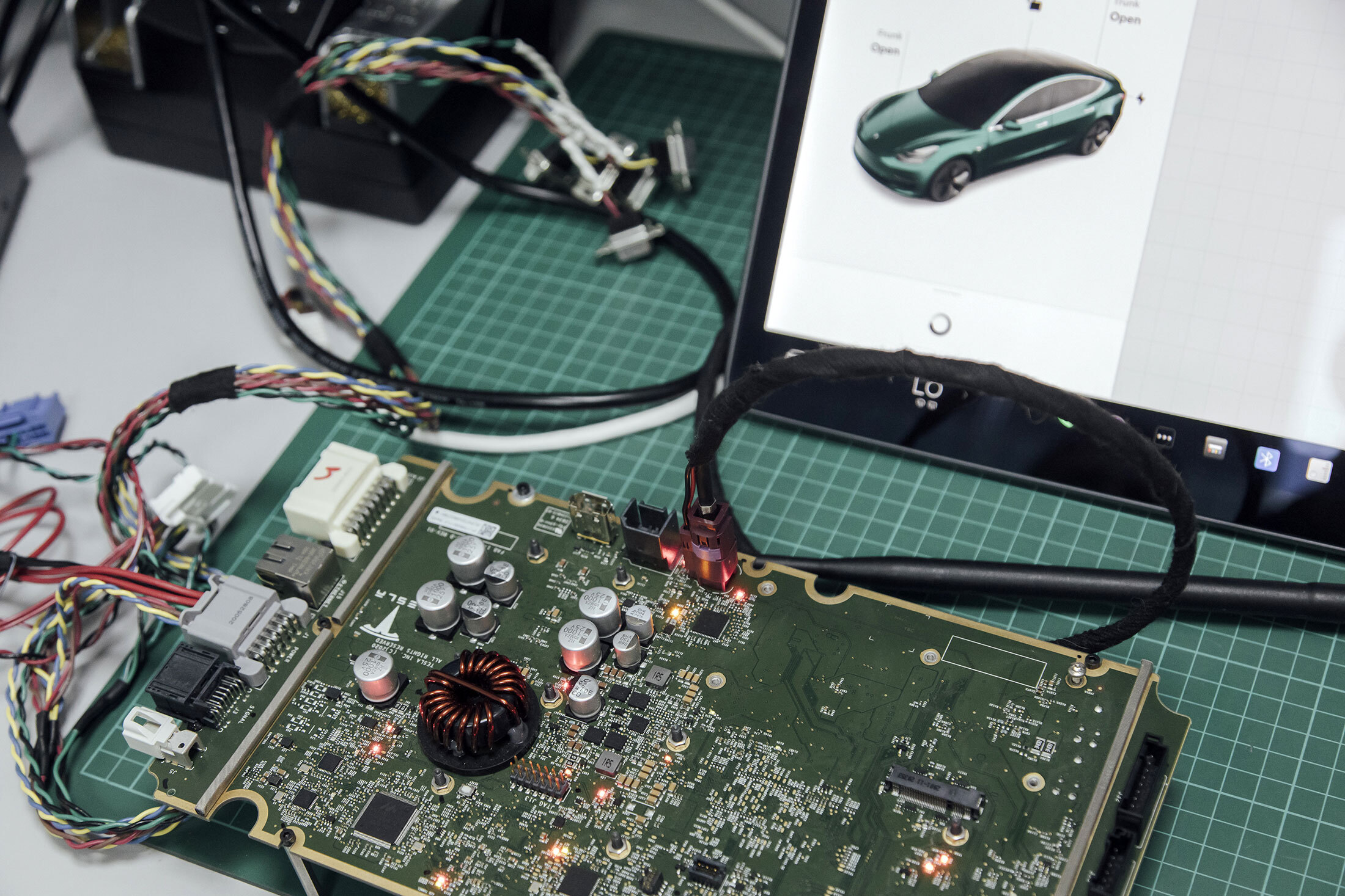 在巴黎Synacktiv总部的硬件实验室里,一块特斯拉主板。