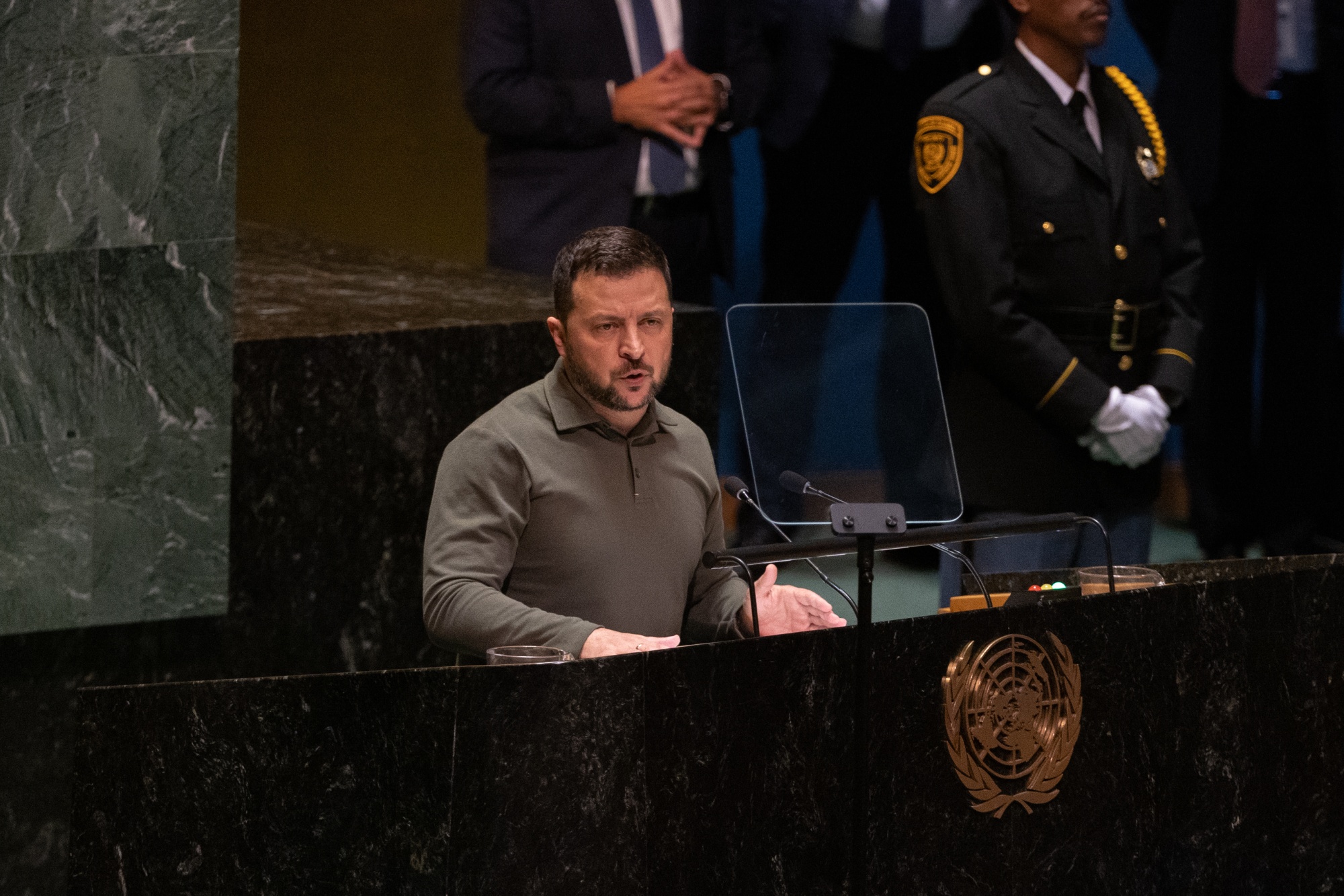 弗拉基米尔·泽连斯基在9月20日向联合国安理会发表讲话。摄影师:Spencer Platt/Getty Images“世界上大多数人都认识到这场战争的真相。这是俄罗斯对我们国家的犯罪和无端侵略,旨在夺取乌克兰的领土和资源,”自俄罗斯于2022年2月入侵以来一直穿着军事风格迷彩服的泽连斯基说。