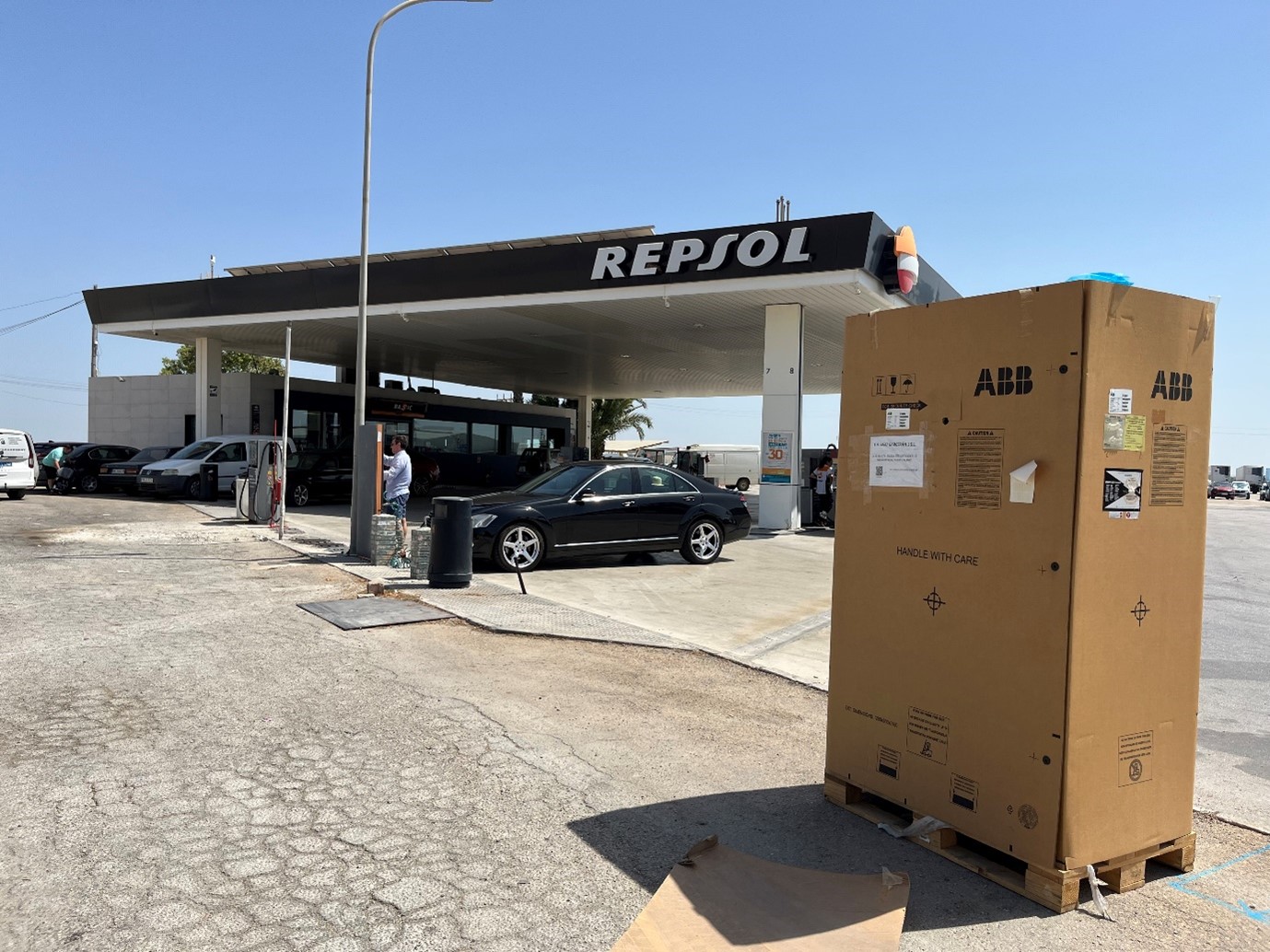 我们很快发现出租车没有儿童座椅,所以我们不得不在加油站停下来买一些。在加油站里,有一个未拆封的ABB电动车快速充电器,看起来准备好安装了。