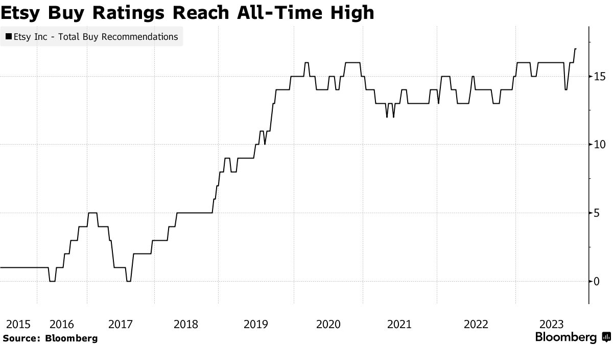 自2021年底以来该指数上表现第二差的在线市场Etsy Inc.现在获得了创纪录数量的分析师买入评级,而根据彭博社编制的数据,其平均目标价暗示着从当前水平上涨近70%,这是在过去21个月中该股下跌了超过三分之二之后的情况。