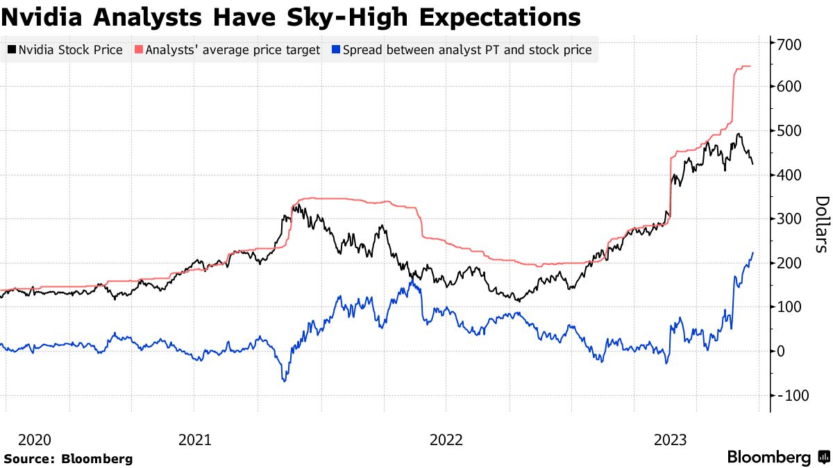 英伟达公司近日的抛售暴露了股价与分析师目标价之间的巨大差距,这些目标价的平均值显示股票有53%的回报潜力。股价与平均分析师目标之间的距离创下了该股的记录。