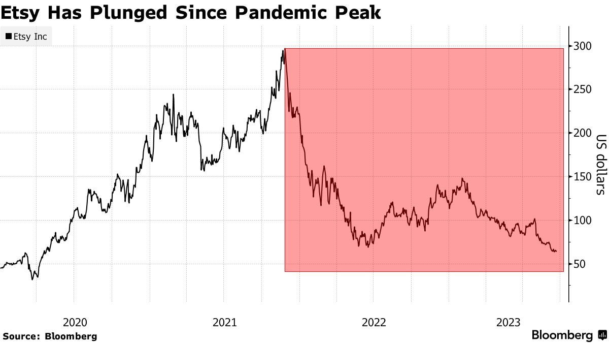 问题在于Etsy的营收增长只是曾经的一小部分。根据彭博社编制的数据,预计2023年销售额将增长7%,而过去五年的平均增长率为46%。