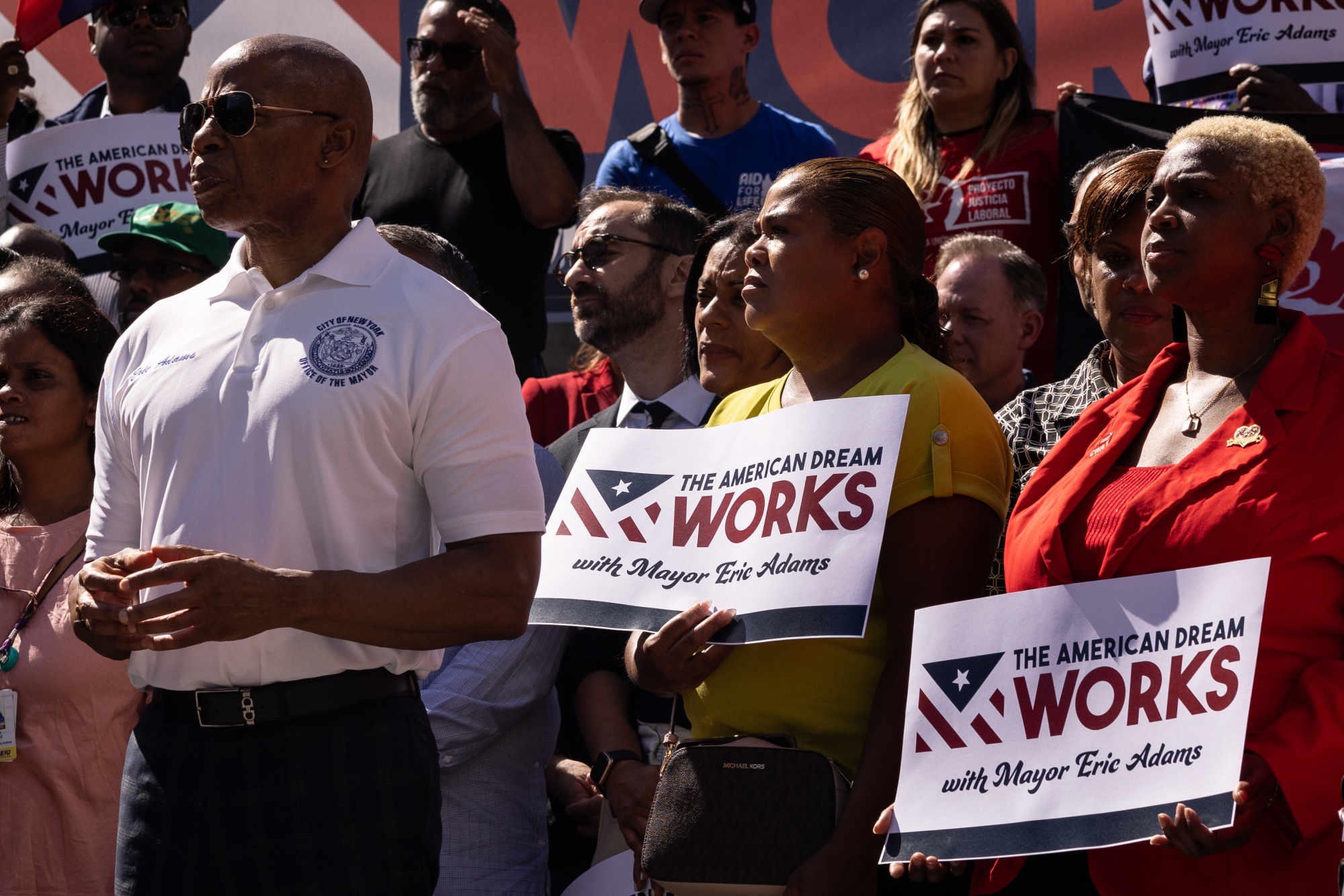 纽约市市长埃里克·亚当斯(左)参加了8月31日举行的一场集会,呼吁加快为寻求庇护者提供联邦工作许可。摄影师:Yuki Iwamura/Bloomberg纽约市市长埃里克·亚当斯长期以来一直警告称,该市承担着照顾成千上万寻求庇护者的费用,将面临120亿美元的财政末日。$12 billion fiscal apocalypse。现在人们开始审查这笔资金的去向。