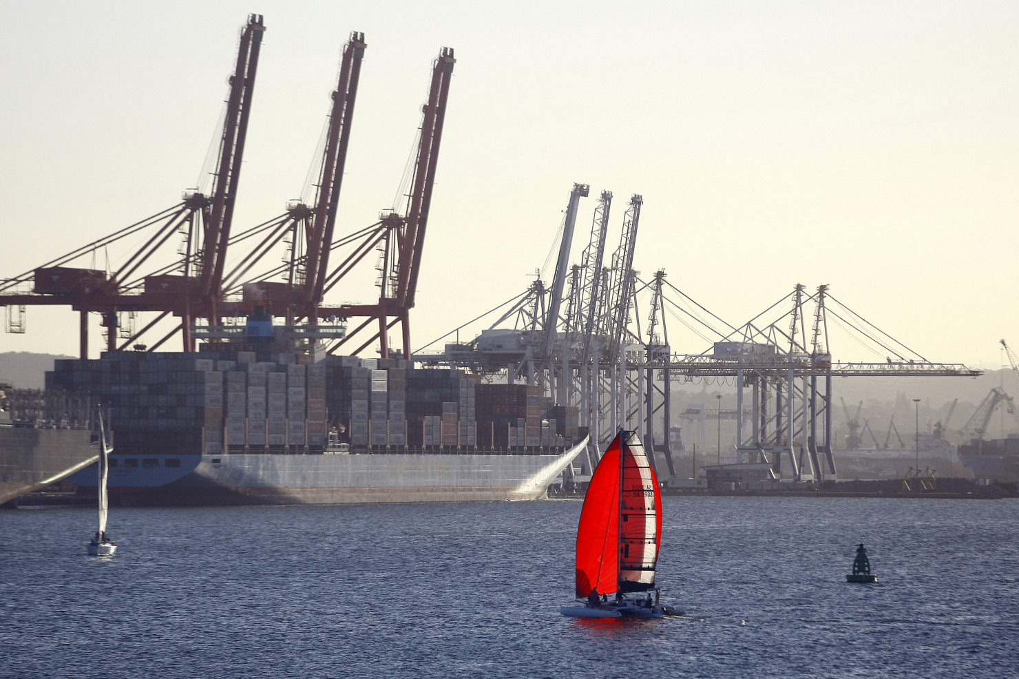 游艇驶过德班港口的集装箱船。摄影师:Kevin Sutherland/Bloomberg
