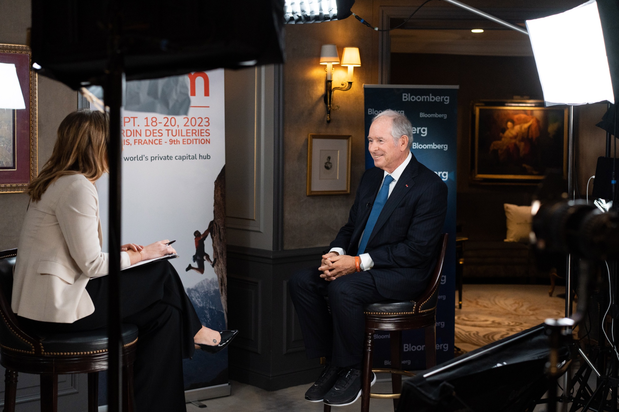 斯蒂芬·施瓦茨曼,黑石集团首席执行官,在2023年9月19日巴黎举行的国际私募股权市场(IPEM)会议间接接受彭博电视台采访。摄影师:Nathan Laine/彭博 然而,这次俯瞰杜乐丽花园的活动中更重要的故事是关于私募股权本身的状态。在经历了一个绝对庞大的筹款和交易十年之后 — “你生活在私募股权的世界中,” 彭博商业周刊在2019年宣布 — 随着利率上升和经济放缓,人们感觉派对结束了。Tikehau Capital的安托万·弗拉马里昂告诉彭博电视台说:“未来会非常颠簸。”
