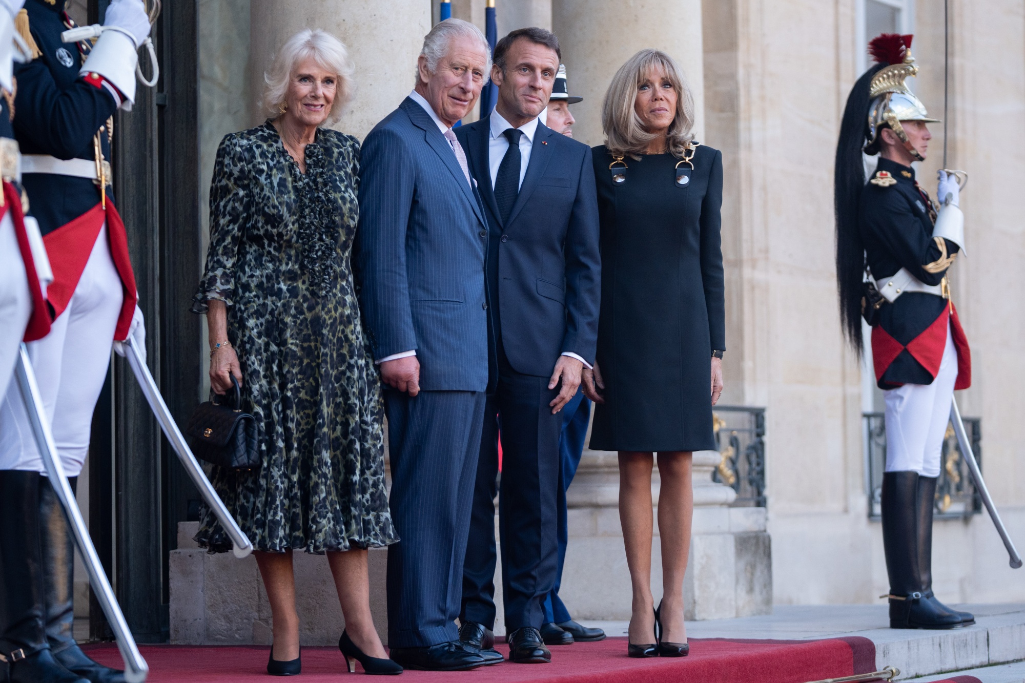 卡米拉女王,查尔斯三世国王,埃马纽埃尔·马克龙和布里吉特·马克龙,从左到右,在2023年9月21日在爱丽舍宫进行皇家国事访问。