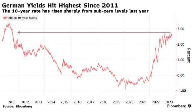 德国债券下跌,导致政府的基准借款成本十多年来最高,投资者押注欧洲利率将保持较高水平更长时间。 10年期证券的收益率上涨了8个基点,达到2.78%,自2011年以来最高。最新的上涨是在美联储周三发出鹰派讯息和美国强劲劳工数据之后,导致交易员预计欧洲央行将保持紧缩政策数年。欧洲央行首席经济学家菲利普·莱恩表示,利率将保持尽可能长的时间限制性。