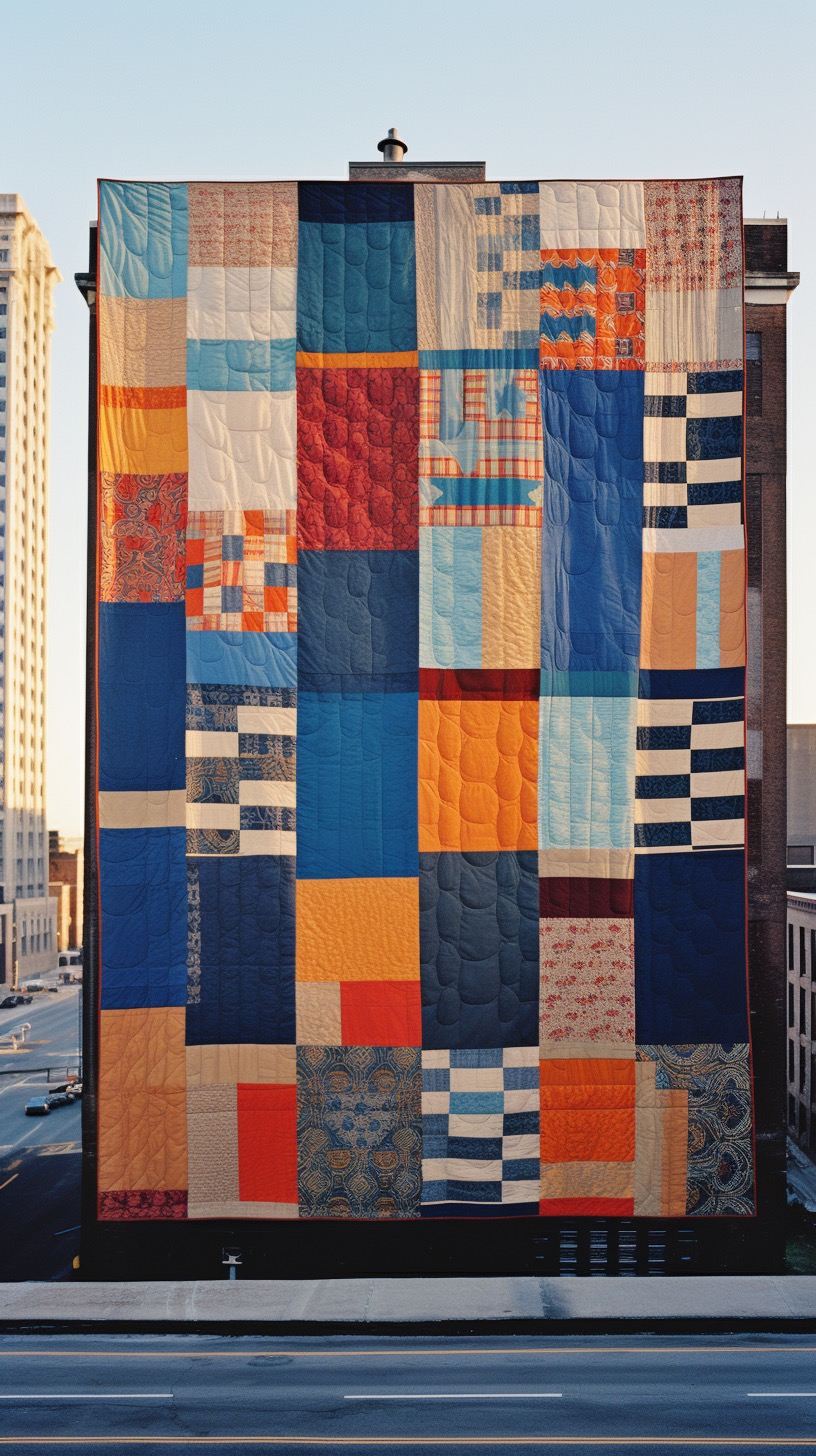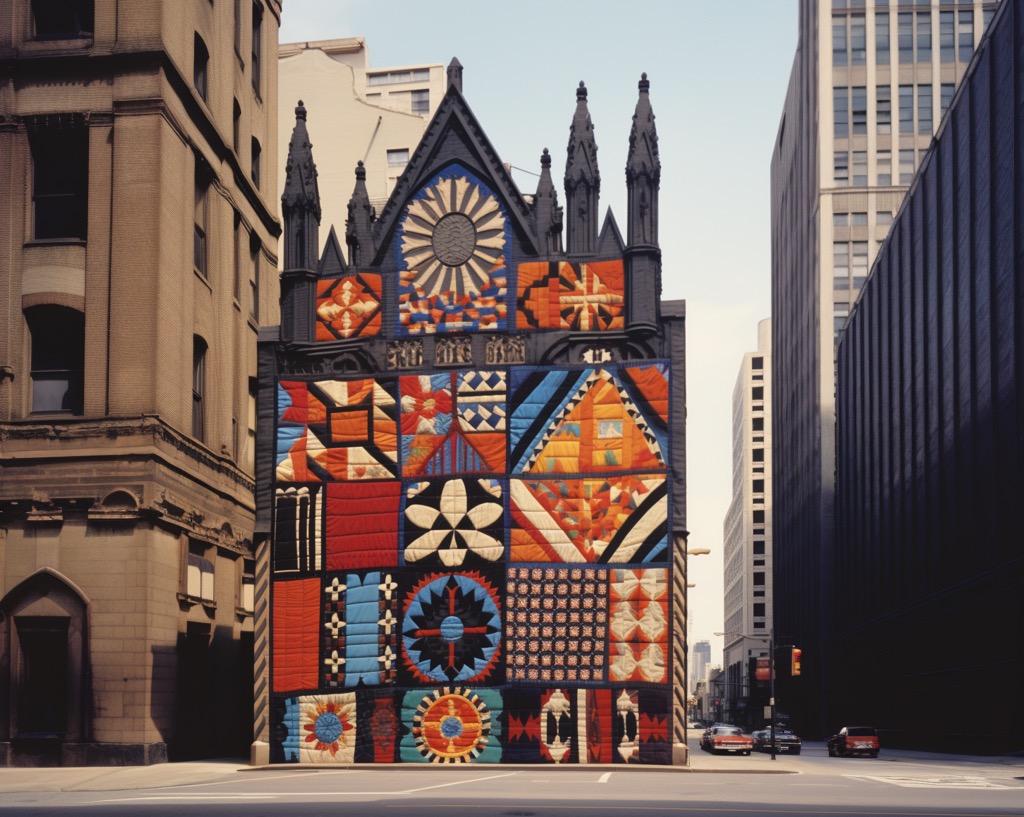 阿拉巴马州吉斯本的黑人拼布者用拼布外观建造摩天大楼的AI生成图像。