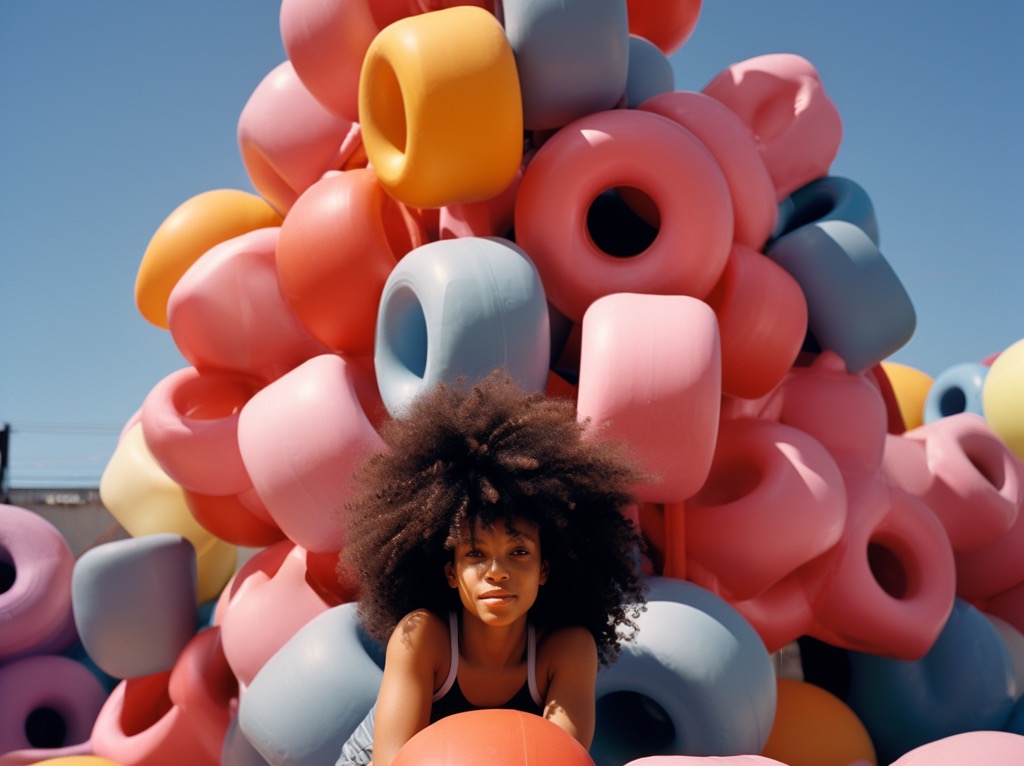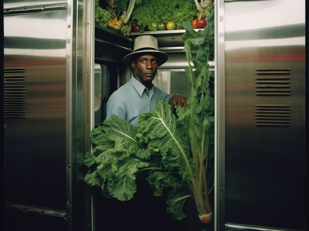 我开始在纽约广泛使用人工智能,所以我从周围的环境中汲取灵感。如果人们在地铁上种植农产品会很有趣吧?我试着每天制作一个这样的作品来练习。这也是我练习引导的一种方式。这就是导致了黑人供应商在户外市场上销售黄金,或者受到黑人头发图案启发的黑人游乐场的原因。