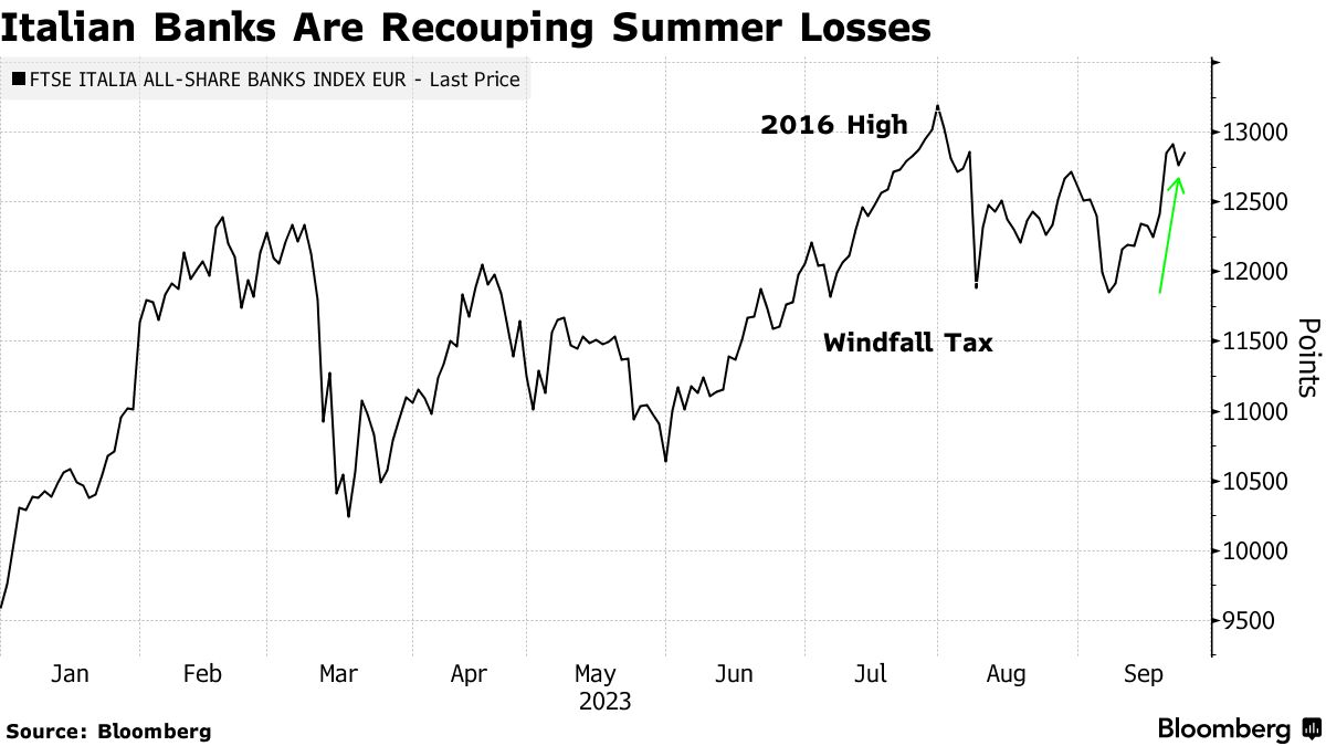 意大利联合信贷银行在米兰交易中转为负值,而意大利圣保罗银行在上午10:30时基本持平,之前曾有所上涨。银行股仍接近在夏季政府提出税收建议时遭受的损失。