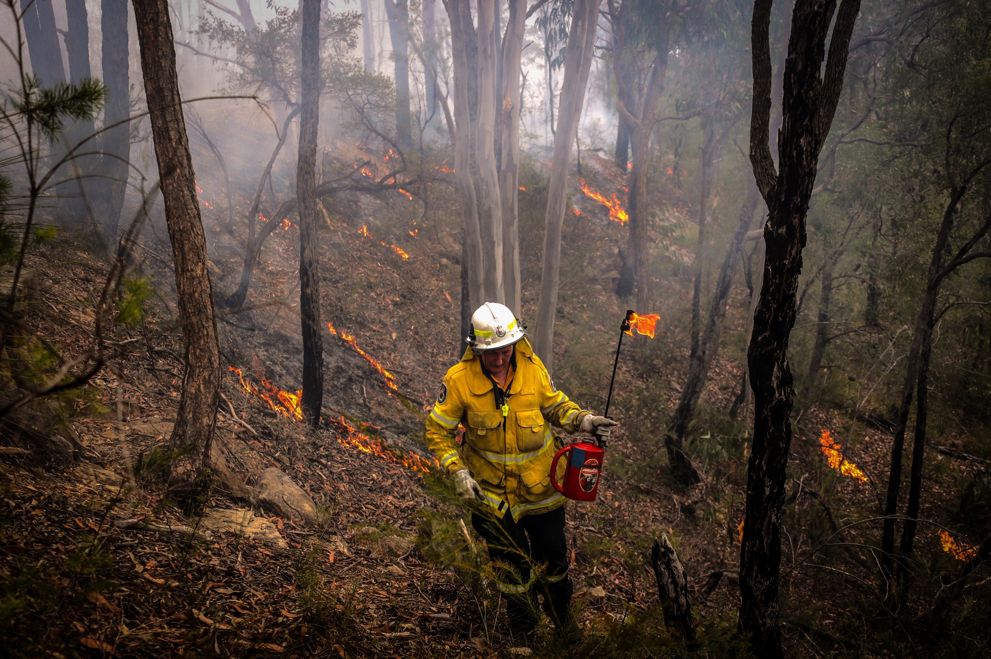 新南威尔士州农村消防服务志愿者在2019年在库尔努拉镇附近的灌木丛中进行防火烧操作。