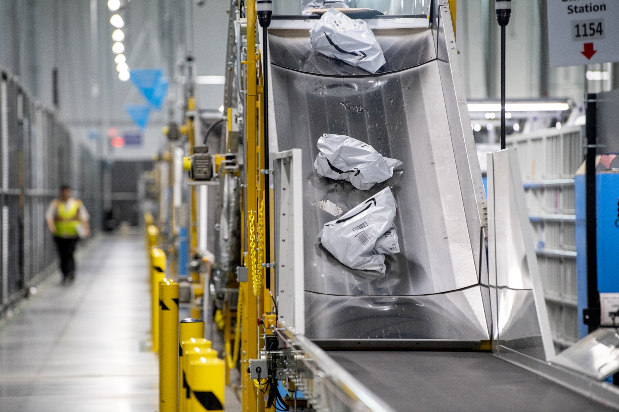 在纽约州梅尔维尔的亚马逊履行中心传送带上的包裹。