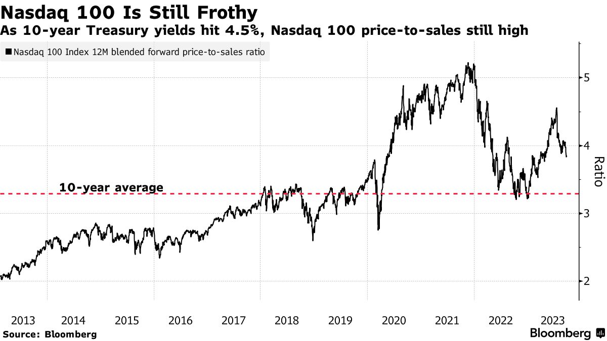 纳斯达克100指数最近的回调使估值降低,但随着收益率上升,仍然相当昂贵。根据最新收盘价,以前瞻性价格销售比率计算,这个科技股重仓指数的交易倍数为3.8倍,远高于其10年平均水平,表明市场仍然存在泡沫。