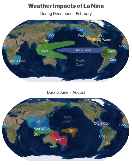 厄尔尼诺对北半球的天气影响在夏季和秋季往往较为温和。在大西洋,它可能产生风切变,即风速或方向的突然变化,这可能会阻止那里的飓风季节;然而,创纪录的暖洋温度导致了繁忙的风暴季节。厄尔尼诺预计将持续到二月。厄尔尼诺通常意味着美洲太平洋沿岸从加利福尼亚到智利再到阿根廷会有大雨。这对阿根廷可能是个好消息,因为那里的干旱创纪录加剧了该国的经济困境。另一方面,2015-16年的上一次大规模厄尔尼诺给美国中西部带来了致命的冬季洪水。厄尔尼诺通常会导致澳大利亚、印度尼西亚、菲律宾和巴西北部的干旱天气。上一次,它减少了印度季风的降雨,使农田干旱,并抑制了象牙海岸的可可、泰国的稻米和印尼的咖啡产量。澳大利亚和南非发生了森林大火。