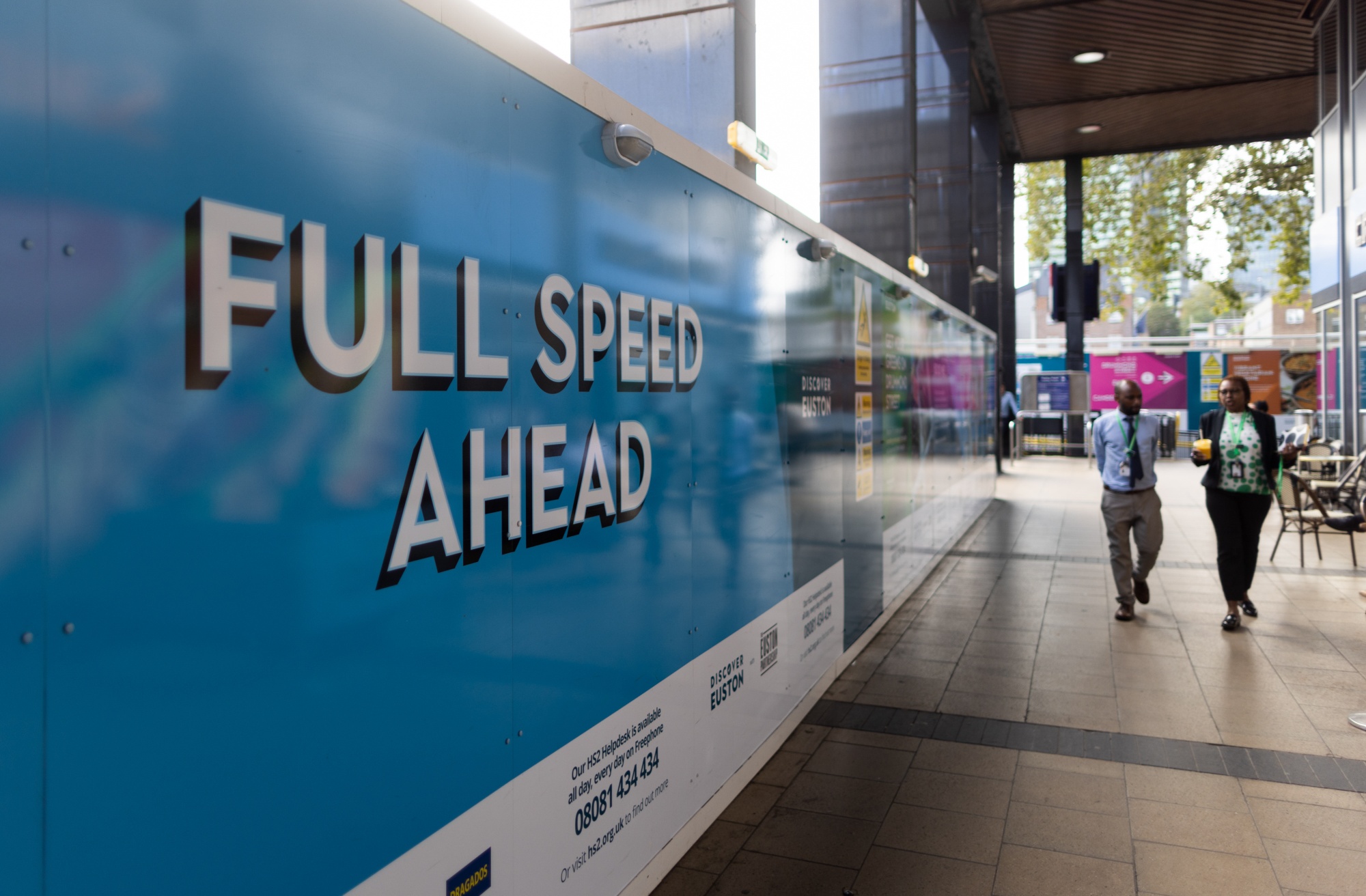 9月25日,伦敦尤斯顿站附近的HS2开发工地围栏。摄影师:Chris Ratcliffe/Bloomberg涉及的是一个得到苏纳克五位前任首相支持的项目,也是保守党竞选纲领承诺的核心内容,即“拉平”北方社区与更富裕的南方之间的机会。保守党在2019年选举中赢得了这些远离工党的地区的支持,而在大多数全国调查中落后20个百分点,他们面临着巩固支持的压力。