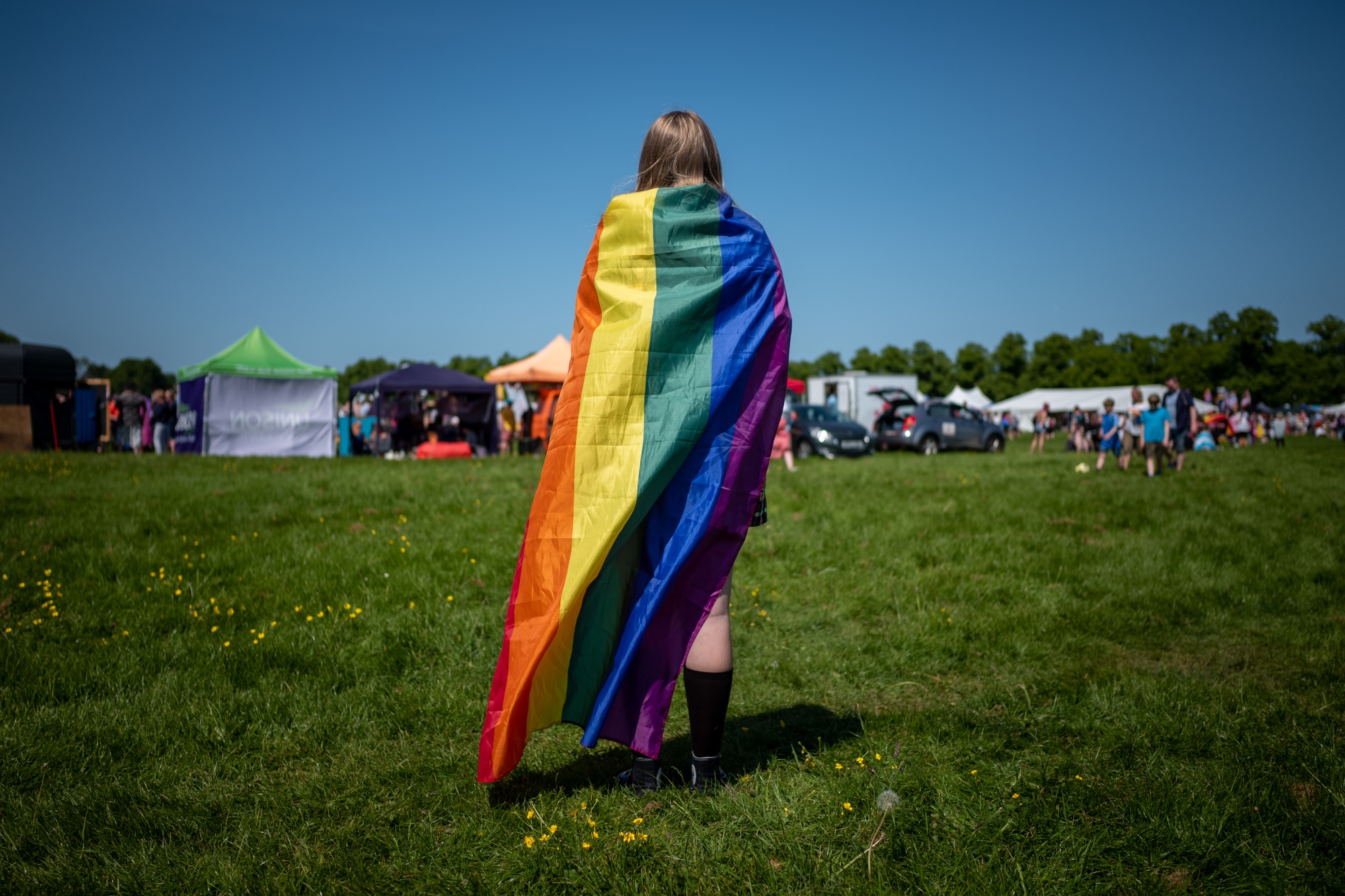一个人在英格兰约克的约克骄傲节上裹着一面骄傲旗。