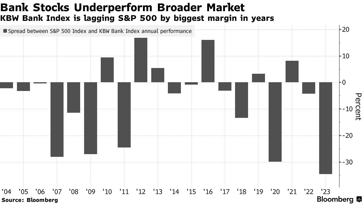 今年以来,银行股因多家地区性银行的倒闭而动荡不安,包括硅谷银行。自3月初动荡开始以来,该行业未能实现有意义的反弹,KBW银行指数今年下跌了23%,而标普500指数上涨了11%。