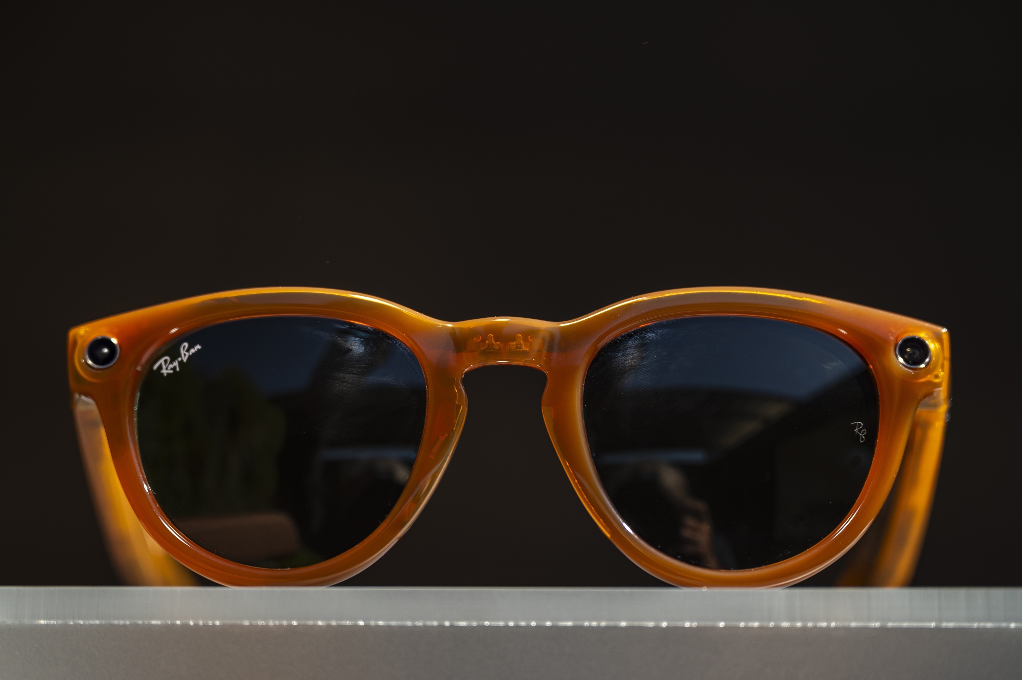 Ray-Ban Meta第二代智能眼镜。摄影师:David Paul Morris/Bloomberg新款式有两种风格——Wayfarer和Headliner——提供标准、偏振、变色和处方镜片选择。售价299美元的眼镜还有不同的尺寸和颜色选项,如光泽、哑光黑色和一款展示内部电子元件的新透明版本。