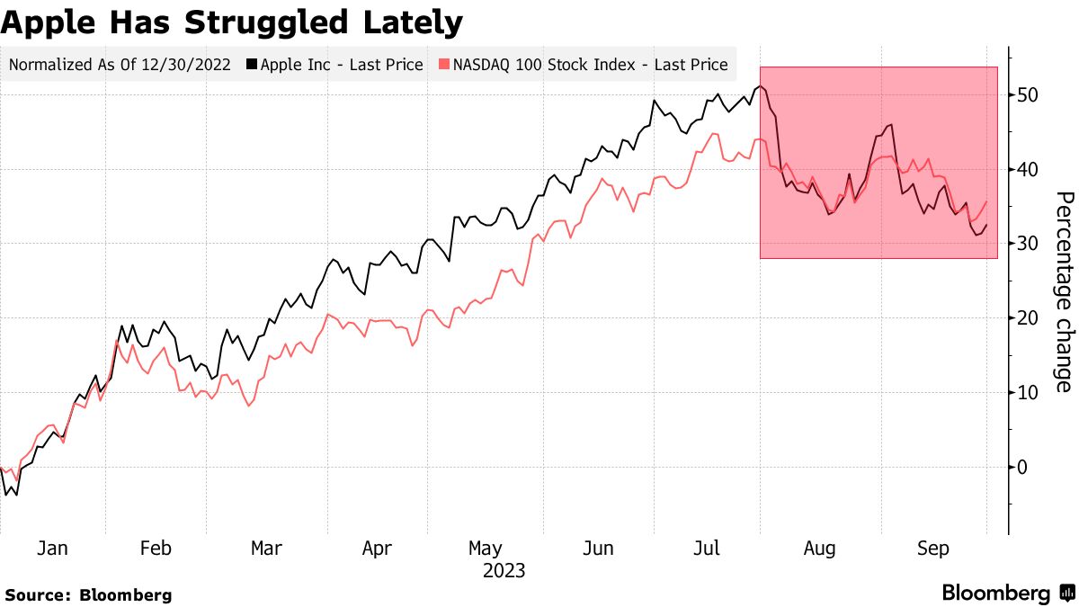 最近几周,这只股票未能兑现其作为避风港的声誉。担忧中国和最近的增长趋势 — 再加上导致科技板块陷入修正的央行政策 — 仅本月就抹去了近2400亿美元的价值。自7月底以来,苹果下跌了12%,而纳斯达克100指数下跌了5.8%。