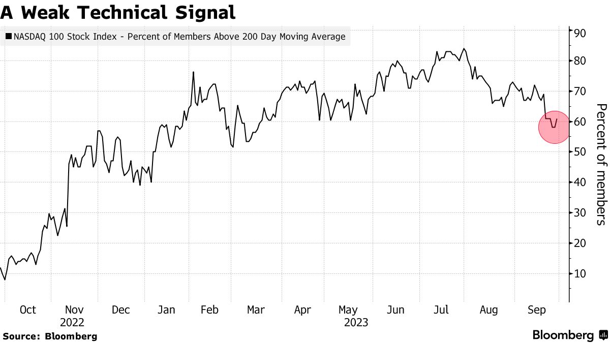 在美联储暗示利率将维持较长时间高位后,最近的抛售行情加剧。这种更加鹰派的立场——导致10年期国债收益率本周飙升至2007年10月以来的最高水平——给科技股带来了压力,并提高了经济衰退的可能性。