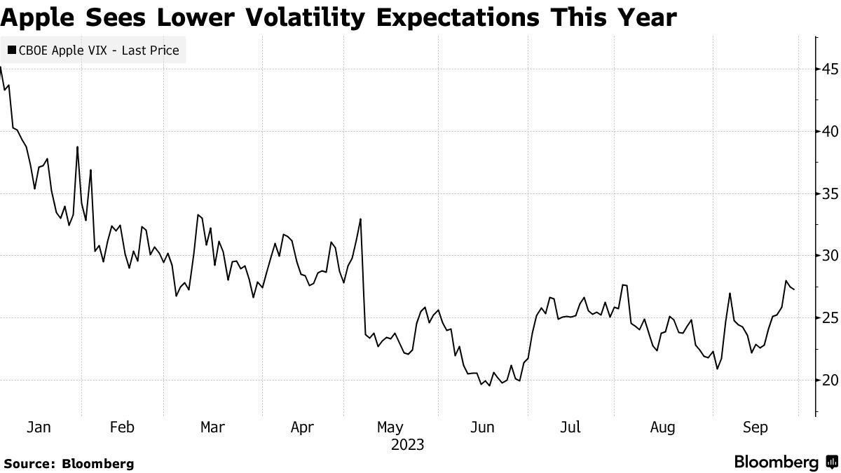 另一个显示投资者对该股票感到舒适的迹象是,CBOE苹果VIX,跟踪该股票未来波动性的市场估计,今年下降了33%,低于其10年平均水平。CBOE NDX波动指数今年下降了22%。