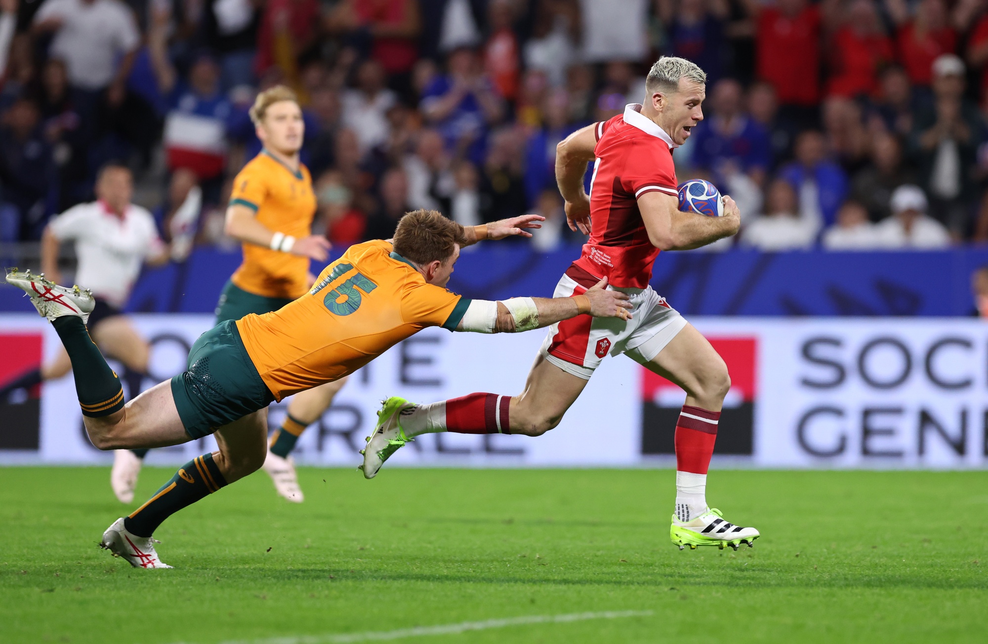 威尔士的加雷斯·戴维斯(Gareth Davies)在2023年9月24日的C组比赛中跑过澳大利亚的安德鲁·凯拉维(Andrew Kellaway)得分,以40-6获胜。摄影师:亚历克斯·利维赛/盖蒂图片社### 下周安排