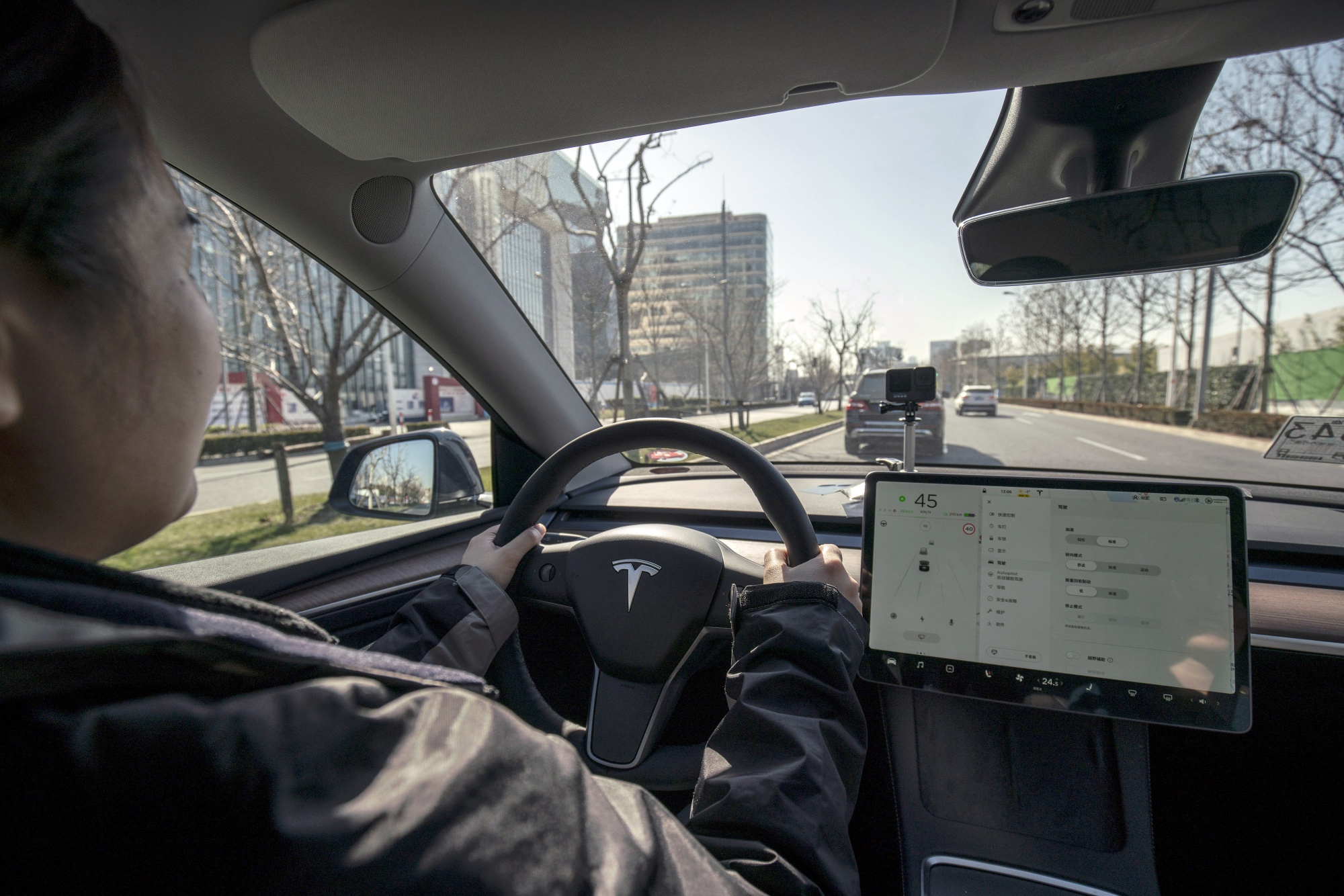 一名销售助理在上海驾驶特斯拉公司的Model Y电动汽车。