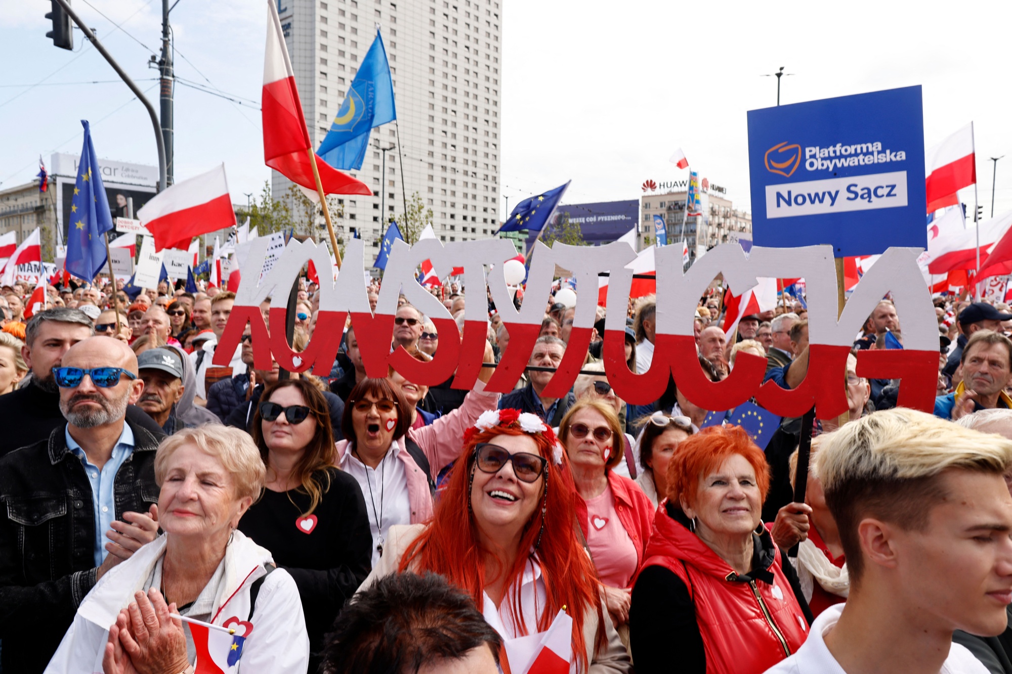 波兰反对派支持者在选举前两周挤满了华沙的街道,选举将由亲欧洲政党对抗试图连任第三届的执政民族主义者。