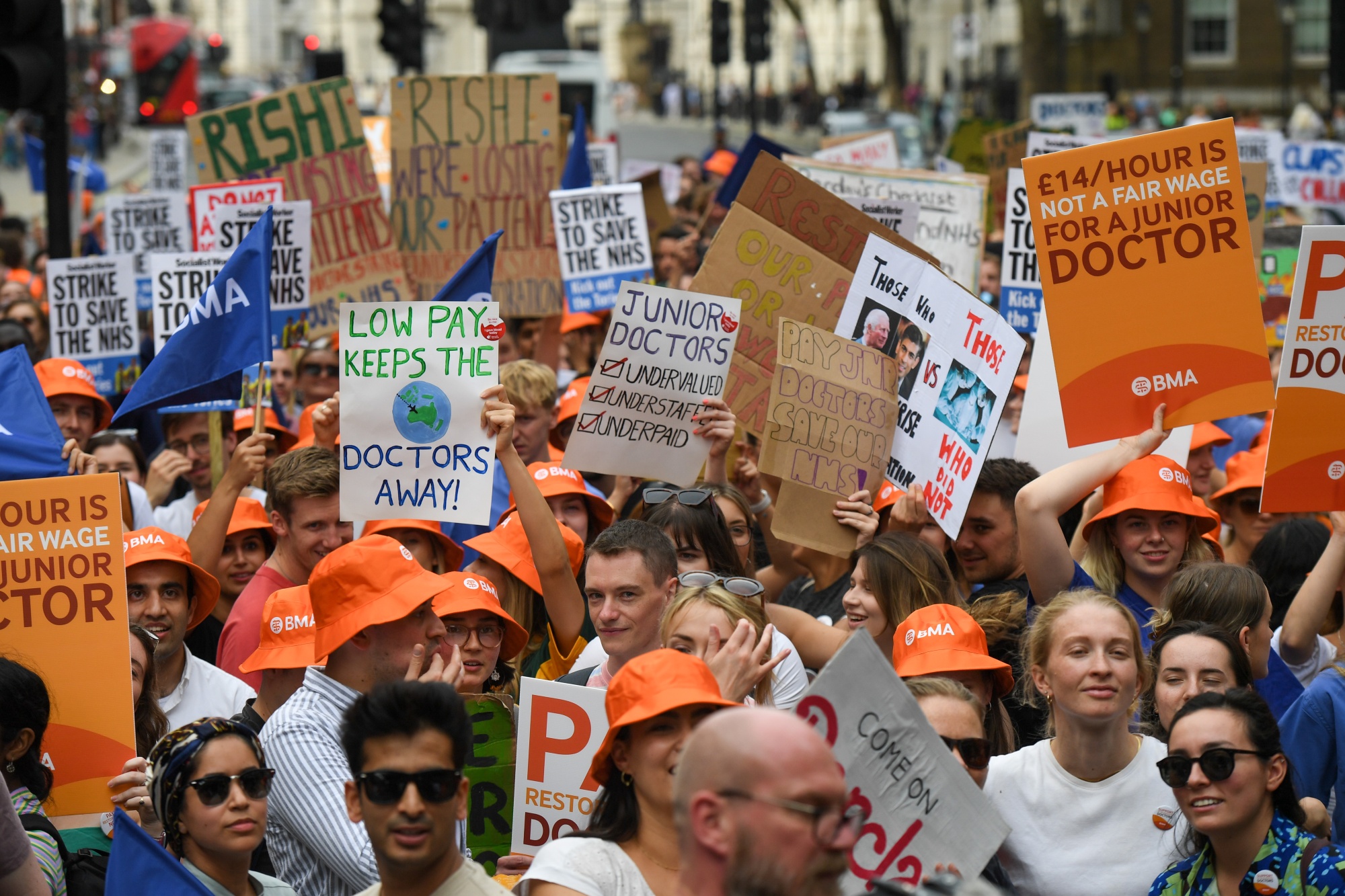 伦敦Downing Street附近的初级医生在八月举行集会。